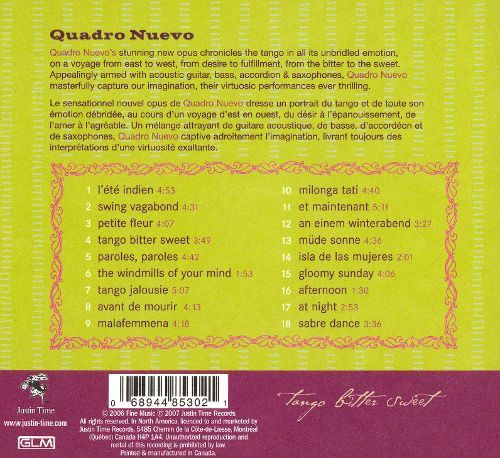 2006년 내놓은 이 음반은 이들 연주 중에 단연 백미라고 하지 않을 수 없다. 이것은 실제로 앞서 소개한 <Mocca Flor> 보다도 훨씬 많은 상을 받은 음반이다. 음반명은 'Tango Bitter Sweet'. 우리말로 번역하면 '달콤 쌉싸름한 탱고' 쯤 된다. 들어보면 정말 달콤 쌉싸름할까. 아니다. 그냥 달다. 필자가 가끔 "애인이 예쁘면 침도 달다" 고 농담처럼 말하는데 정말 이 음반은 음악이 달다.