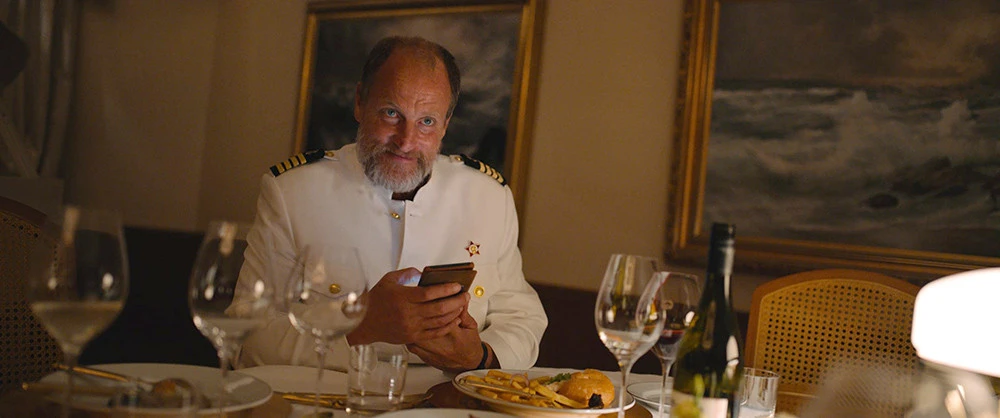 하지만 이 영화에는 큰 반전이 존재한다. 선장이 이 크루즈의 최고 빌런이라면 빌런인데, 이 선장은 날씨가 제일 안 좋은 날에 선장 주최 만찬을 개최해 사정없이 흔들리는 배 안에서 저녁을 대접한다. 배멀미를 참아내지 못한 승객들은 여기저기 토를 해대며 체면을 제대로 구겨버린다. 배의 상황은 더욱 악화되어 화장실의 오물이 역류해 배 안을 가득 채우고 있는데, 이 선장이란 놈은 갈수록 가관이다. 이 아수라장 속에서 그는 자본주의 사회에서 태어난 사회주의자 코스프레를 하며 한 승객과 명언 배틀이나 하고 있다. 승객들은 오물을 뒤집어 쓰고, 구명 조끼 입고 벌벌 떨고 있는데, 선장은 사회 안에서 자신보다 더 윗계급인 승객들을 비꼬는 많은 명언들을 지껄인다.