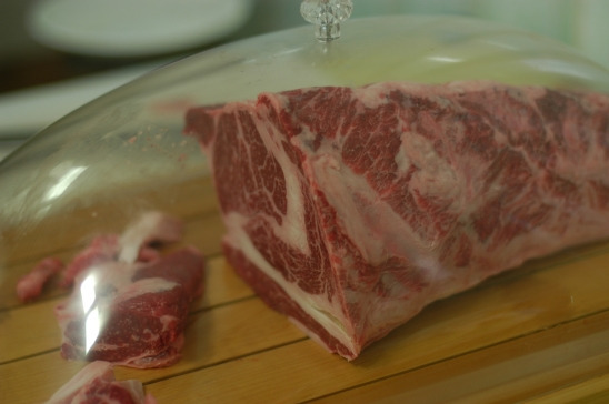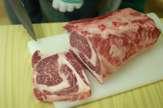 잘린 면의 색이 다릅니다. 좀 더 짙은 빛이 나네요, 신선한 고기는 공기를 만나 숙성이 되어야 선홍빛으로 변한다고 합니다.