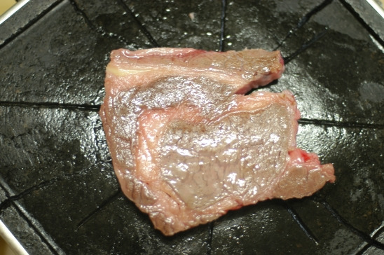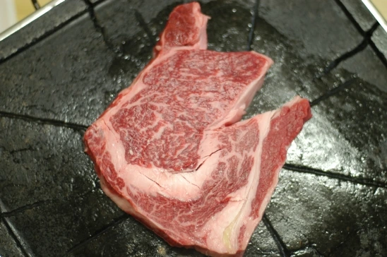 그런데 여기는 일반 브루스타를 썼습니다. 판만 돌판입니다. 왜일까요? 숯의 향이 고기의 향과 맛을 해치는 것을 막기 위함이라 합니다. 살짝만 익혀서 그 향을 맡게 해 주셨는데, 정말 달콤한 향이 나더군요... 참고로 이 고기는 한우 암소 1++ 등급입니다.