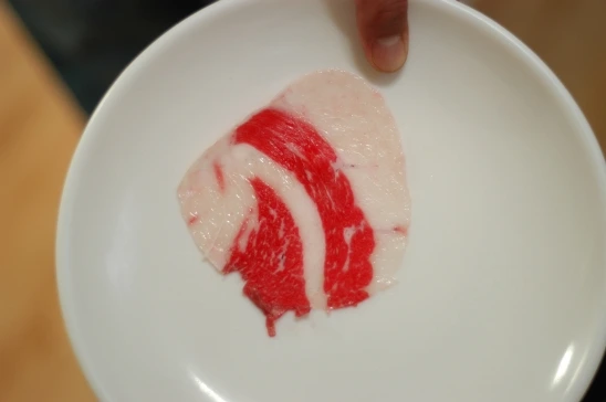 차돌박이는 아래 사진처럼 9자 모양의 지방이 박혀있는 넘을 말하는데, 소 한 마리에서 나오는 양이 무척 작다고 합니다. 9의 둥근 부분이 차돌처럼 박혀있고, 9의 직선 부분이 뿌리처럼 박혀있어서 차돌박이라는 이름을 가지게 된 거라네요~ 차돌박이는 질긴 부위라 얇게 썬다고 합니다. 얇게 썰었기에 살짝 익히건, 많이 익히건 부드럽게 먹기에는 상관이 없다고 합니다.