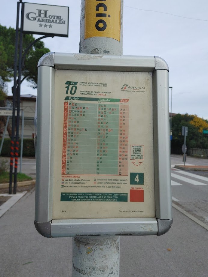 기다려서 보니 구글이 알려준 제시간에 버스 한 대가 이쪽으로 온다. 나는 그 시간에 공항으로 가는 것이 아니라 맞는지 확인이 필요했기에 버스가 내 눈앞에 왔을 때 그냥 무작정 올라가서 버스기사에게 물어봤다. 내일 오전에도 공항으로 가는지. 이 친절한 버스기사는 내일 아침 그 시간에 여기에 온다고 친절하게 웃으면서 말을 해준다. 그 때야 안심이 되어 나는 긴장이 풀렸다. 나는 "땡큐"라는 말을 하고 다시 내려 반대편에 있는 정류장에서 파도바 시내를 가는 버스를 기다렸다.