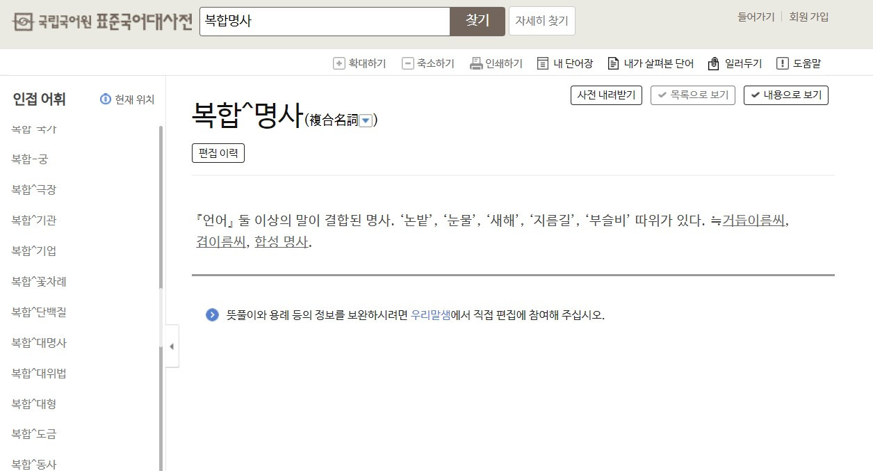 위에서 예로 든 '복합 명사'는 '복합^명사'가 표제어로 올라, '복합명사'도 '복합 명사'도 맞다는 것을 보여주고 있다.