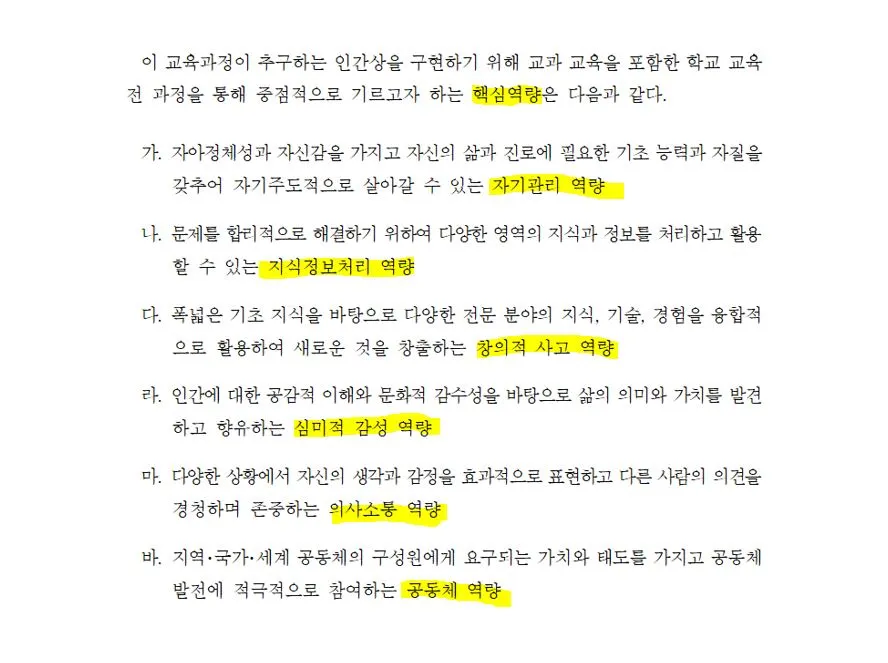 먼저, 역량중심 교육과정이 교육과정에 어떻게 반영되어있는지 살펴보자. 먼저 초중등교육과정 총론 문서 I. 교육과정 구성의 방향 - 1. 추구하는 인간상에 "핵심역량"이라는 말이 나타났고, 6가지 핵심 역량을 다음과 같이 제시하고 있다.