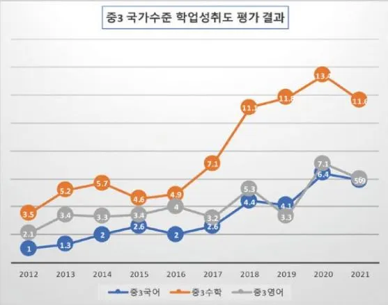 통계청 학업성취도 평가(교과별 성취수준 비율)