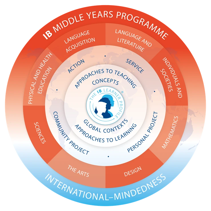 IBMYP는 다음과 같은 교육과정 모형을 나타내고 있다. 가장 바깥에는 IB가 지향하는 글로벌 마인드를 제시하고, 그 안에는 글로벌 마인드 함양을 위한 8개의 학문 영역, 그 안에는 봉사와 체험활동, 지역사회 프로젝트, 개별 프로젝트, 그리고 가장 중앙에는 수업 설계 도구인 ‘교수학습접근방법’. ‘콘셉트’, ‘세계적 맥락’이 위치하고 있다.
