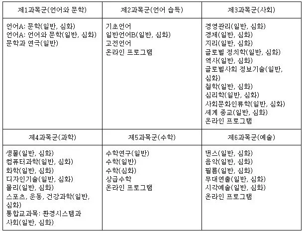 중핵의 세 개의 과목을 둘러싸고 있는 것은 6가지의 교과목 그룹이다. '언어와 문학(studies in language and literature)', '외국어(language acquisition), 사회(individuals and societies), 과학(sciences), 수학(mathematics), 예술(the arts) 그룹이 있다. 여기서 각 그룹별로 소속 교과목들이 있고 학생들 각자 자신의 수준 및 진로와 관심 분야에 따라 선택을 하게 된다. 2025년부터 현장의 극구 반대에도 불구하고 막무가내로 추진되고 있는 고교학점제가 떠오르기도 한다. IBDP는 고교학점제 체제 하에서 추진되기 매우 좋은 체제이기도 하다.