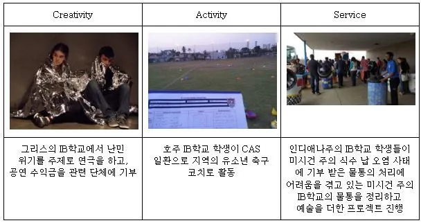 이 활동은 여러 방식으로 할 수 있는데, 동아리를 만들어도 되고, 교내에서 어떤 이벤트를 열어도 되고, 바자회를 열든지, 각자가 스스로 주도해서 창의적인 활동을 수행하고 기록한다. IB학교 홈페이지에 소개된 예시들을 살펴보자. 창의 활동으로 그리스의 IB학교에서 난민 위를 주제로 연극을 하고, 이 공연 수익금을 난민들을 돕는 단체에 기부하는 이런 활동을 학생들이 진행을 했다고 한다. 그리고 어떤 호주의 IB학생은 고등학생 때 지역의 유소년 축구팀의 코치로 활동을 했다고 한다. 운동을 하더라도 어떤 의미를 더해서 하는 것을 볼 수 있다. 그리고 봉사 활동의 예시로 인디애나주의 한 IB학교 학생들이 미시간 주의 식수 납 오염 사태로 많은 물을 기부받고 있지만 빈 물통 처리에 어려움을 겪고 있는 미시간 주의 IB학교의 물통을 정리하고 거기에 이렇게 예술을 더한 프로젝트 진행한 사례가 소개가 되어 있다. 결국 창의 활동에 액티비티와 봉사가 들어있고, 봉사에도 창의가 들어 있다.