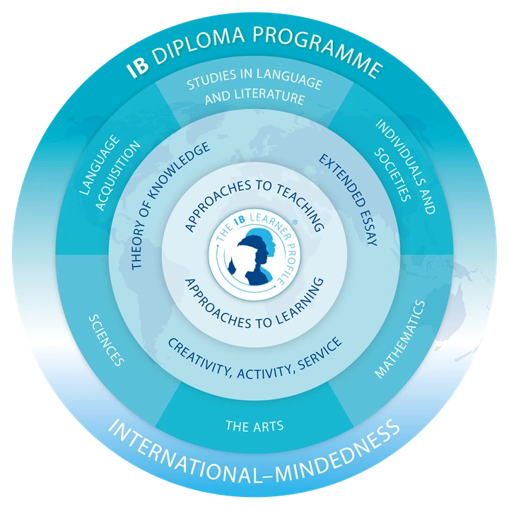 IBDP, IB의 고등학교 교육과정은 3가지 중핵 과목과 중핵을 둘러싸는 6가지의 과목 그룹들로 이루어져 있다. 3가지 중핵과목을 먼저 살펴보면, 'Extended Essay(EE)'라고 불리는 소논문 과목, 'Theory of Knowledge(ToK)'라고 불리는 인식론 과목, 그리고 'Creativity, Activity, Service(CAS)'로 불리는 창의적 체험활동 과목으로 구성되어 있다.