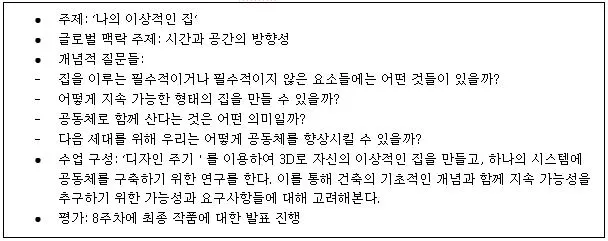 IB MYP 교과목 중에서는 IBDP에는 없던 과목 중 하나인 디자인 과목만 본고에서 살펴보고자 한다. 다음은 IB 학교에서 디자인 교과의 8주간 진행된 수업의 예시이다. 주제는 ‘나의 이상적인 집’이고 이 수업을 설계한 교사는 글로벌 맥락 주제 중에서 ‘시간과 공간의 방향성’을 채택하였다. 그리고 배움을 통해 이런 개념적 질문들에 대한 답을 찾아가도록 하고 있다. ‘집을 이루는 필수적이거나 필수적이지 않은 요소들에는 어떤 것들이 있을까? 어떻게 지속 가능한 형태의 집을 만들 수 있을까? 공동체로 함께 산다는 것은 어떤 의미일까? 다음 세대를 위해 우리는 어떻게 공동체를 향상할 수 있을까?’와 같은 개념적 질문들이 있다.