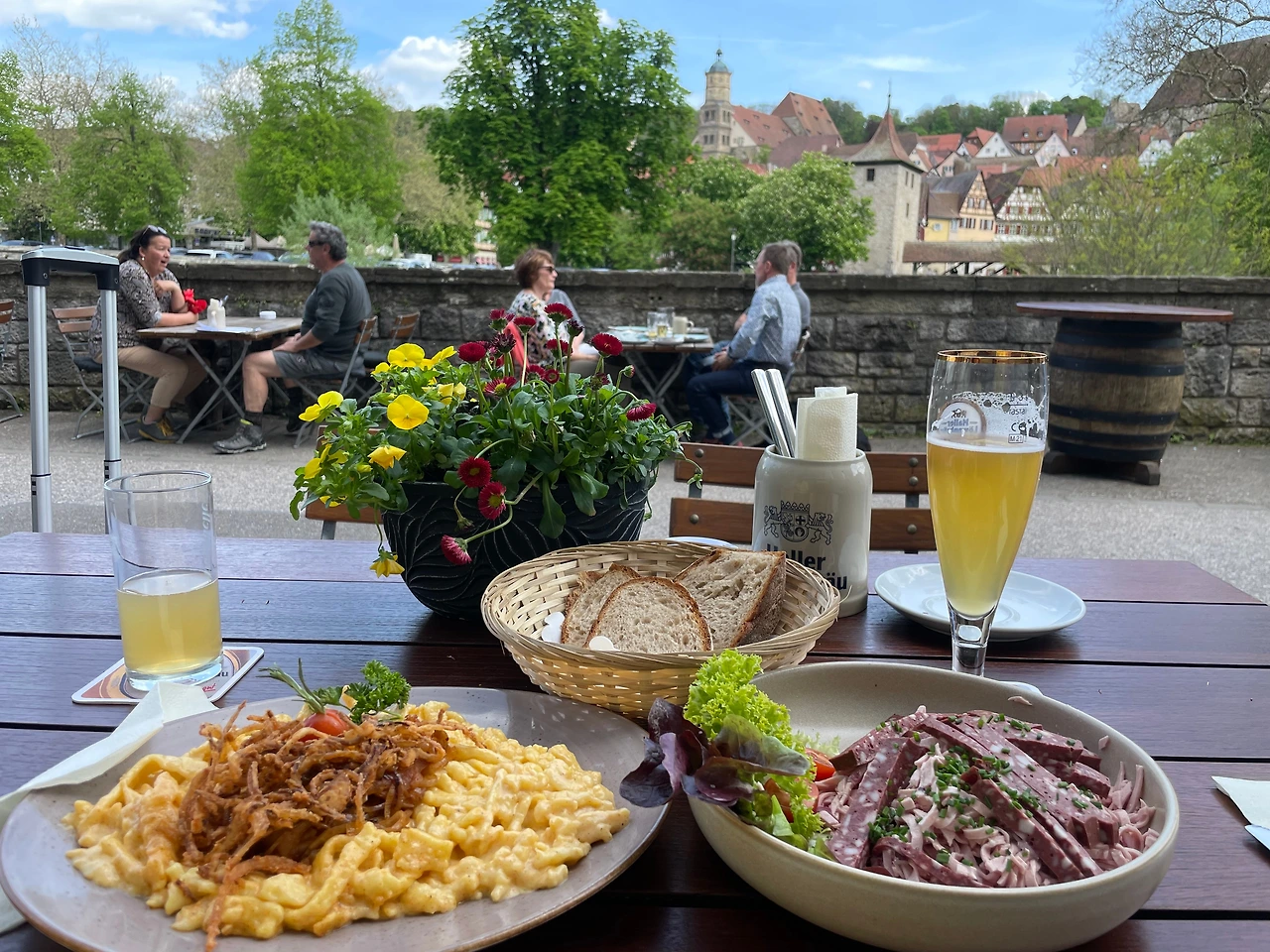 미로 같던 박물관을 다 둘러보고 나니 배가 고파졌다. 점심을 먹기로 했고, 또 지나가다 보았던 강가의 거리에 이는 양조장과 함께 운영하는 식당으로 가기로 했다. 내가 좋아했던 독일 음식인 Käsespatzle과 독일이면 역시 소시지라는 생각에 Schwäbisches Wurstsalat를 주문했다. 마실 것으로는 나는 작은 맥주 한 잔, 엄마는 Apfelschorle. 독일 맥주는 “역시나”였다! 그러나 음식은… 너무 짰다. 우리가 그렇게 음식을 남길 때가 없는데 꽤 남기고 말았다. 독일 음식은 기본적으로 짜기는 하는데 관광객이 없는 곳, 더 현지스러운 곳일수록 더욱 짜다.