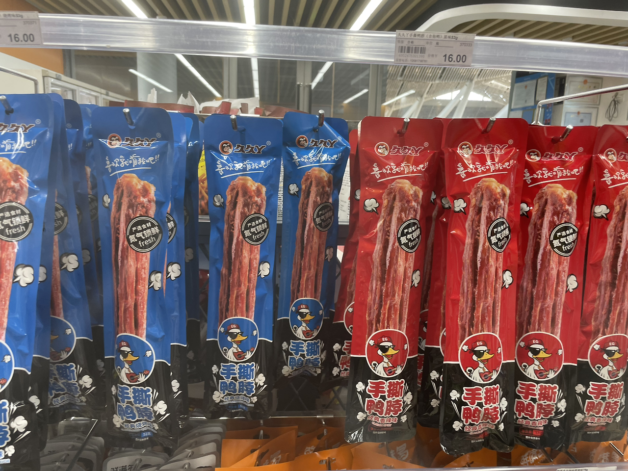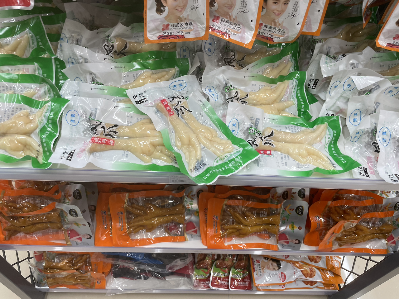 중국에서의 첫 끼를 먹고 시간이 많으니 역 안에 있는 모든 가게를 구경했다. 그래봤자 편의점과 기념품 가게. 그러나 만만치 않은 편의점이었다. 우선 닭발을 정말 사랑하는지 닭발 스낵 종류가 아주 많았으며 더 놀라웠던 것은 오리 목 스낵과 통째로 파는 베이징 오리였다. 베이징 오리 패키지를 만졌다가 고스란히 느껴지는 오리의 형체에 놀라 손을 뗐다. 재미있는 구경이었다.