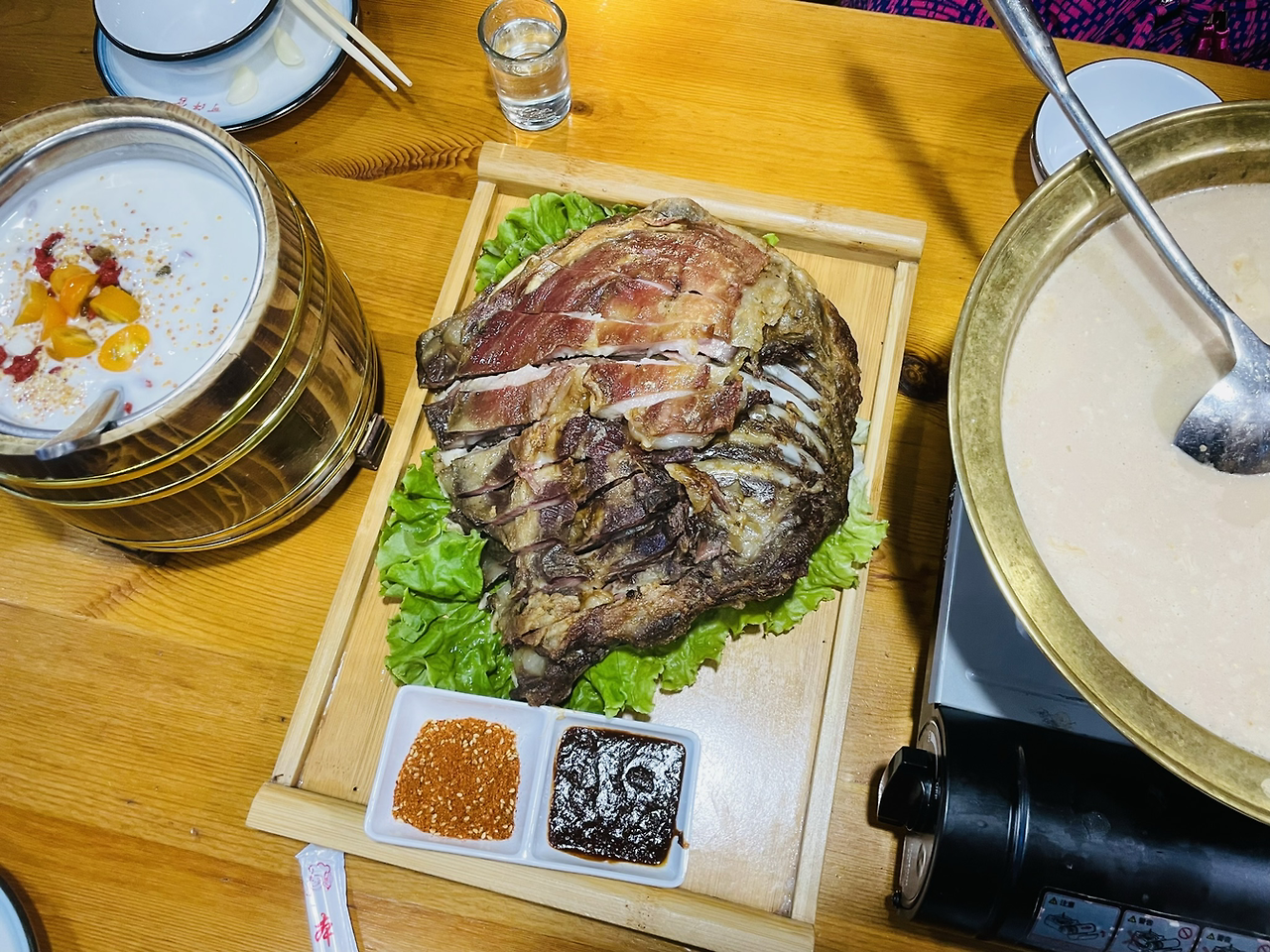 저녁 식사는 몽골식이었다. 양 갈비뼈 한쪽을 통째로 드러내 낸듯한 양갈비와 소금을 넣어 마시는 몽골식 밀크티, 요거트, 미트파이를 주문했다. 양갈비는 집에서 치킨 뜯을 때처럼 뼈채로 잡고 뜯어먹는 것이라고 해서 그렇게 했더니 아주 좋아했다. 다 먹을만하기는 했지만 그중에서도 나는 요거트를 가장 많이 먹었다. 다른 음식은 뭐랄까 맛있기는 했지만 내게 익숙한 맛은 아니었고, 요거트만이 내가 ‘아는 맛’이었으며 양갈비의 느끼함을 잘 잡아주었다. 예전에 한국 여학생 4명이서 터키 여행을 할 때 뷔페식당에 가서 보기엔 화려하지만 입에 맞지 않아 먹을 것이 없었어서 우리가 ‘아는 맛’인 오렌지만 몇 접시를 먹었던 게 생각이 났다.