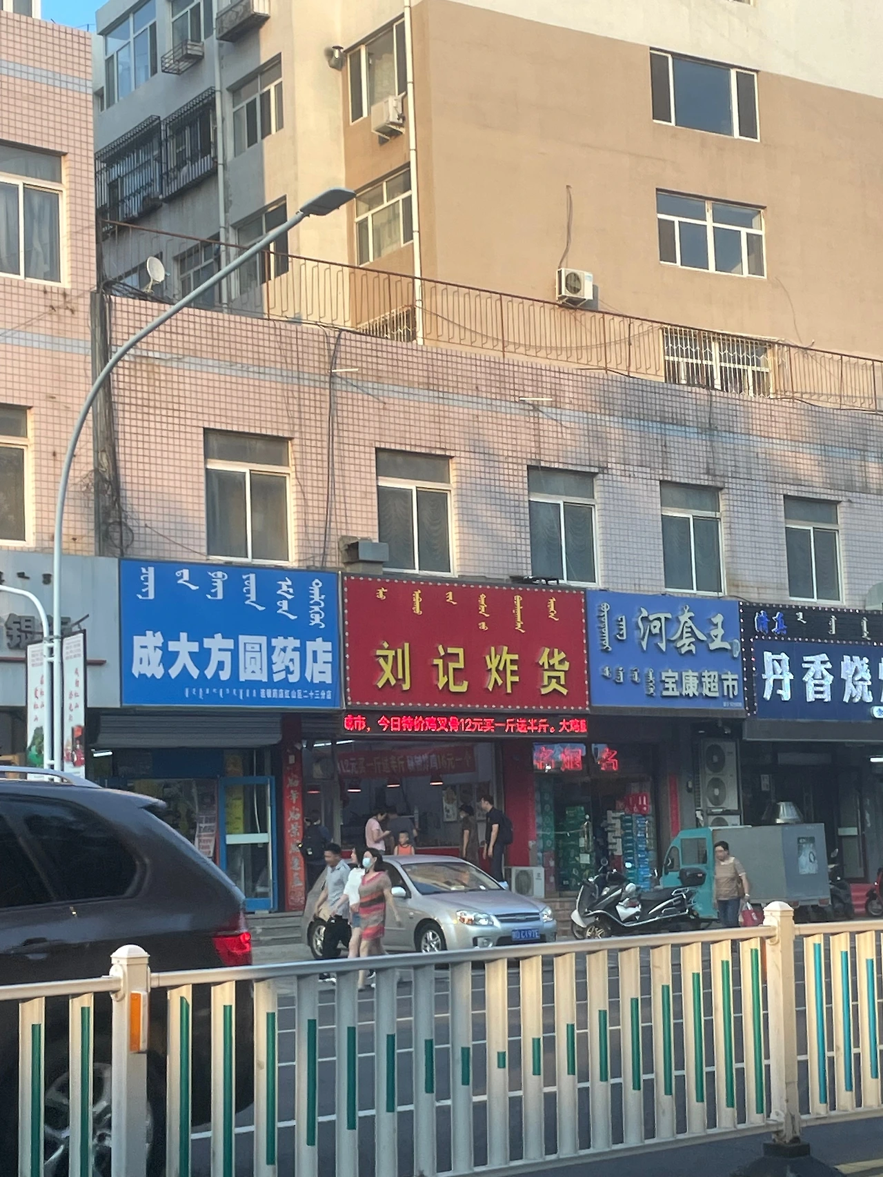 자다가, 창밖을 구경하다, 약간의 대화를 하다, 2시간 반을 달려 츠펑(Chifeng)이라는 도시에 도착했다. 내몽골자치구 안에 있는 도시로, 외국인들에게 잘 알려진 곳은 아니다. 다른 중국인 친구들도 내가 그곳까지 간 것에 놀라워하기도 했다. 검색해 보면 익스피디아 같은 곳에나 몇 가지 정보가 나오고 일반인들의 블로그 같은 정보는 거의 없다. 중국 연변에 중국어와 한국어가 같이 쓰이는 것처럼 이곳에는 중국어와 몽골어가 함께 쓰인다. 그래서 모든 간판에는 중국어와 몽골어과 병기되어 있다. 낮 온도가 높고 햇빛이 강하지만 건조한 지역이라 덥지 않고 저녁에는 매우 선선하다.