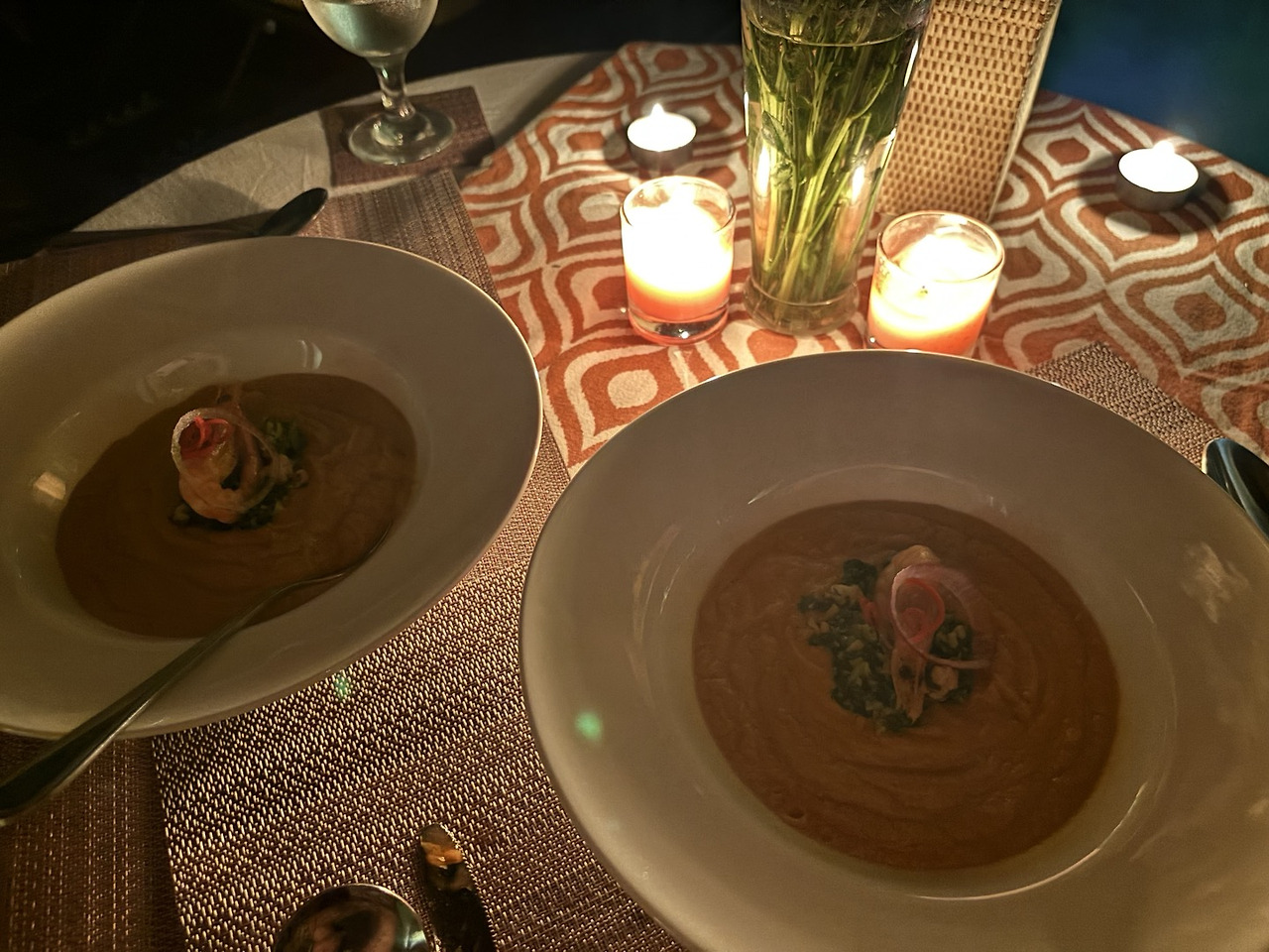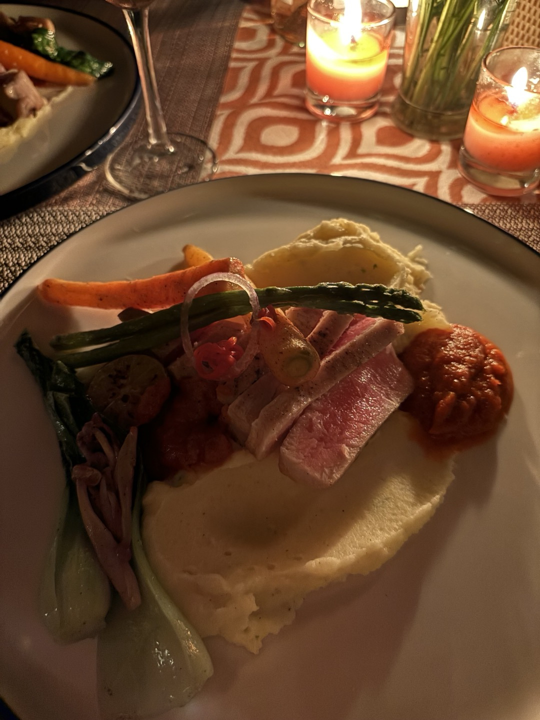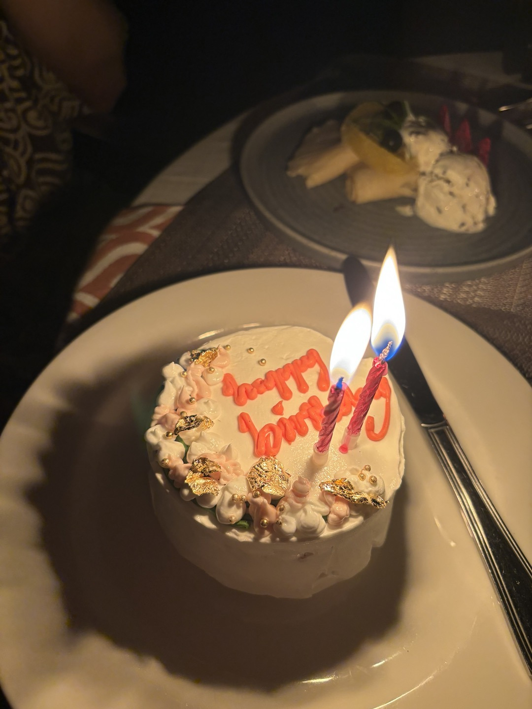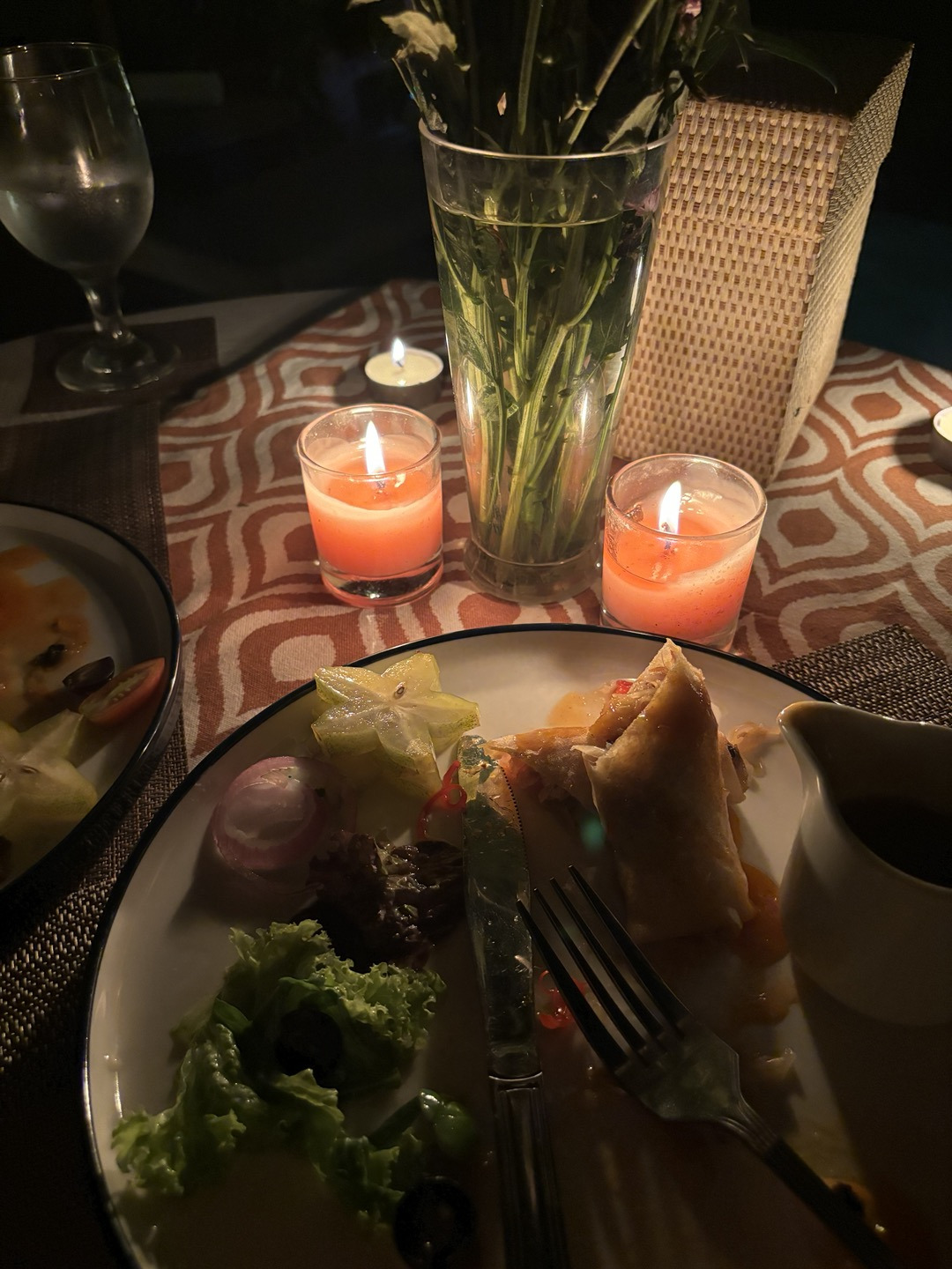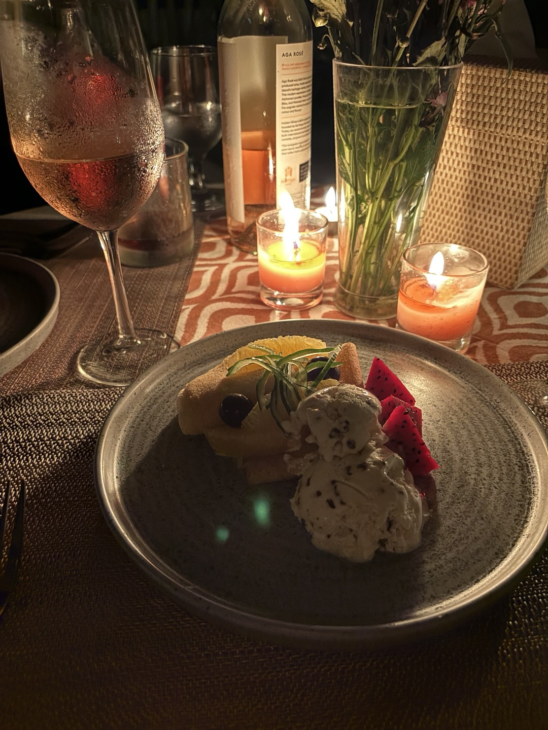 애피타이저, 수프, 참치스테이크(발리에서 육고기를 먹으면 안 된다는 걸 숱하게 깨달아서...), 디저트로 이어지는 4코스에 로제 와인이 곁들여졌다. 마지막엔 생일케이크도 주셨다.