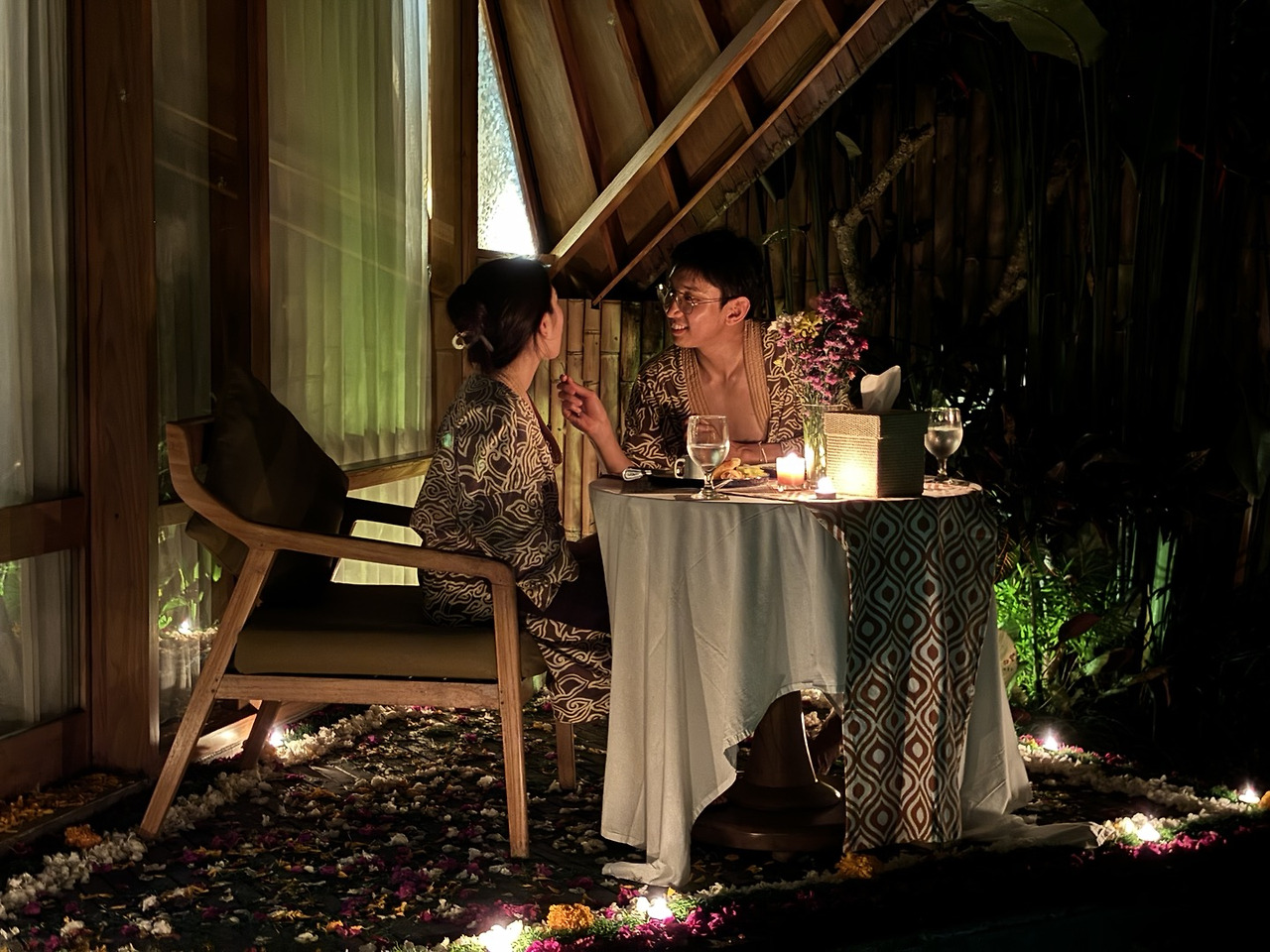 7시에 저녁을 준비해 주기로 한 발리 직원들은 7시에 세팅을 시작하고는 우리를 꽤 오래 기다리게 했는데, 나는 이 이벤트가 남편이 원하는 것은 아닐지도 모른다는 생각과 또 오랜 기다림에 이걸 한 것이 잘한 것인가, 하는 생각도 잠깐 들었다.