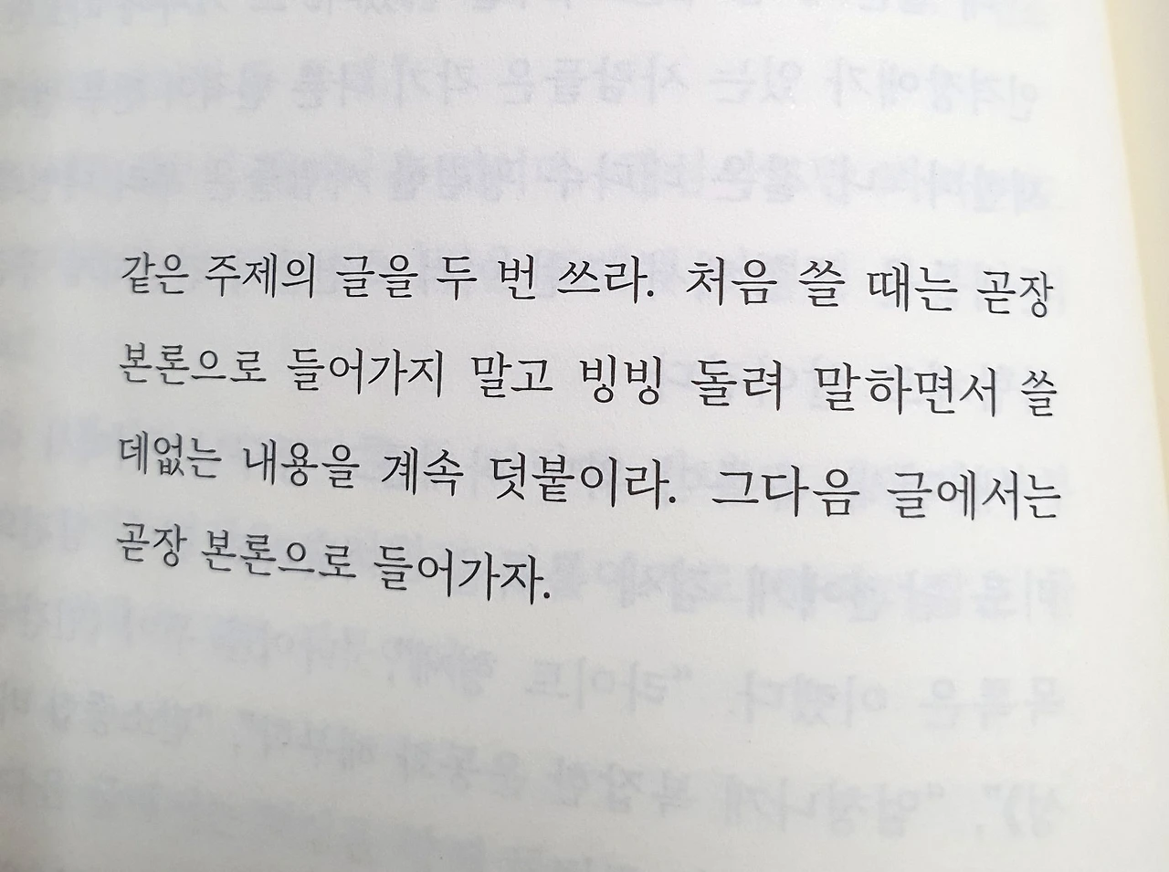 뒤에 이어지는 내용은, 같은 내용에 대해 빙 둘러서 이야기하는 것과 곧장 핵심으로 나아가는 것의 두 예시를 보여준다. 곧장 핵심으로 나아가는 글에서는 당연히 불필요하다고 여겨지는 부분이 삭제되었다. 신기하게도 내가 적어두고 싶은 내용은 삭제된 부분에 있었다. 작가는 무엇이 더 나은 글쓰기라고 말하지는 않았다. 다만 길잡이에서 보듯이 같은 내용을 두번 써보라고 한다.