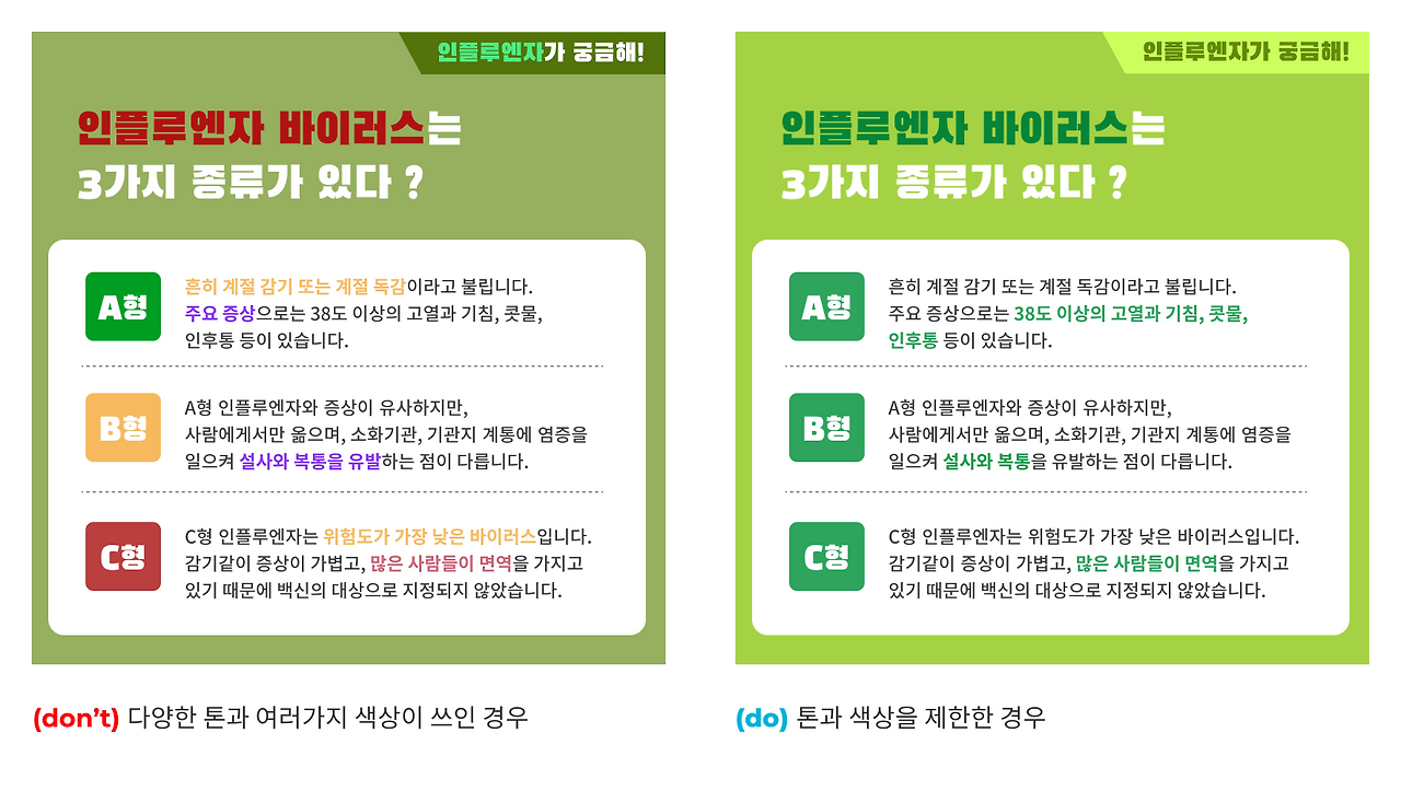 색상은 카드 뉴스 한 페이지 내에서 2~3개로 쓰는 것이 좋다.