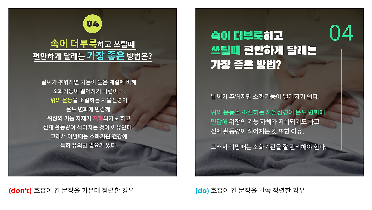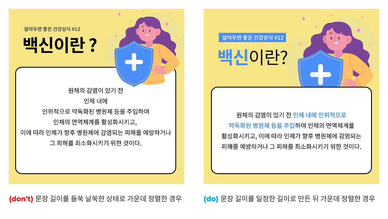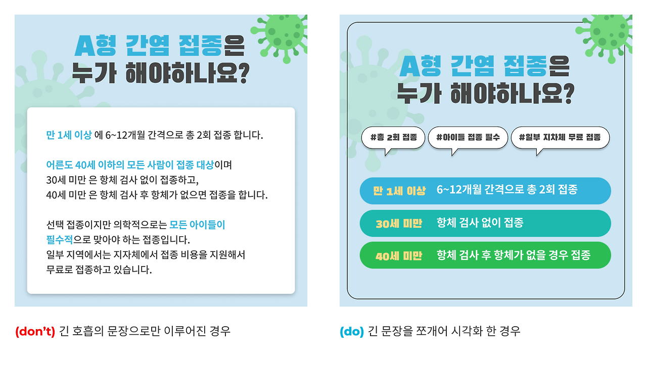 카드 뉴스 제작 시에는 긴 문장을 그대로 나열하지 말고 쪼갠 뒤 시각화하는 것이 정말 중요하다.