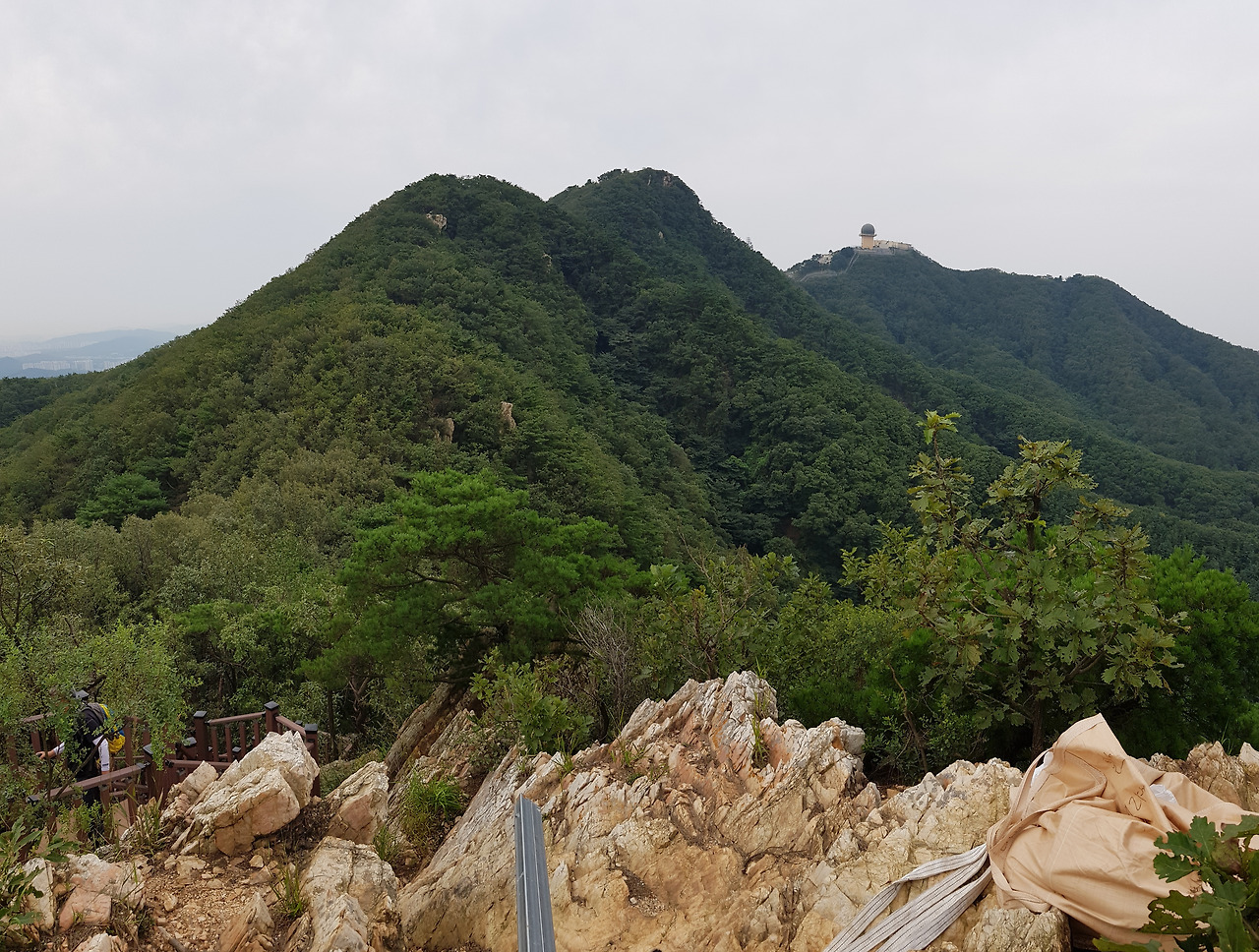 군 시설물이 자리한 슬기 봉의 허리춤으로 난 나무데크에 올라 수암봉 쪽을 한 번 조망하고 태을봉 쪽으로 길을 잡았다. 산본 쪽을 향해 고개를 내민 형상의 바위가 자리한 봉우리 위에 이정표 등 새로 설치하려는 시설물들이 널려져 있다. 늦은 감이 있기는 하지만 남한산성과 연인산에 이어 2009년 경기도의 세 번째 도립공원으로 지정된 산에 걸맞은 조치라는 생각이 든다.