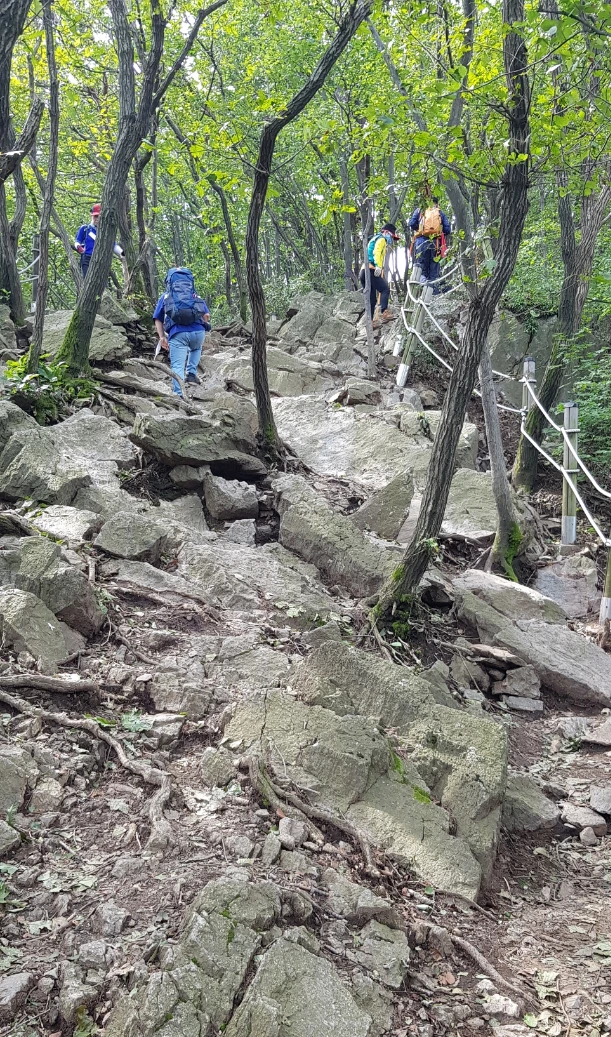 가파른 밧줄 바위 능선에 나무 계단이 놓여 오르고 걷기에 한결 편하다. 자연 친화적일 뿐 아니라 사람 친화적인 계단이다.계단을 올라 날카로운 바위 투성이 칼바위 능선을 지난다. 터널 밖 짧은 구간 고속도로가 지나는 병목안에서 차량 소음이 확성기처럼 증폭되어 귀를 따갑게 때린다.
