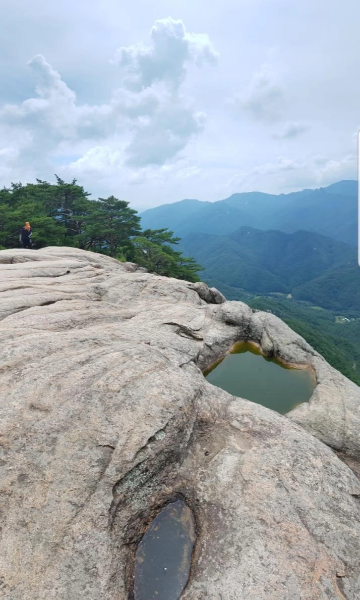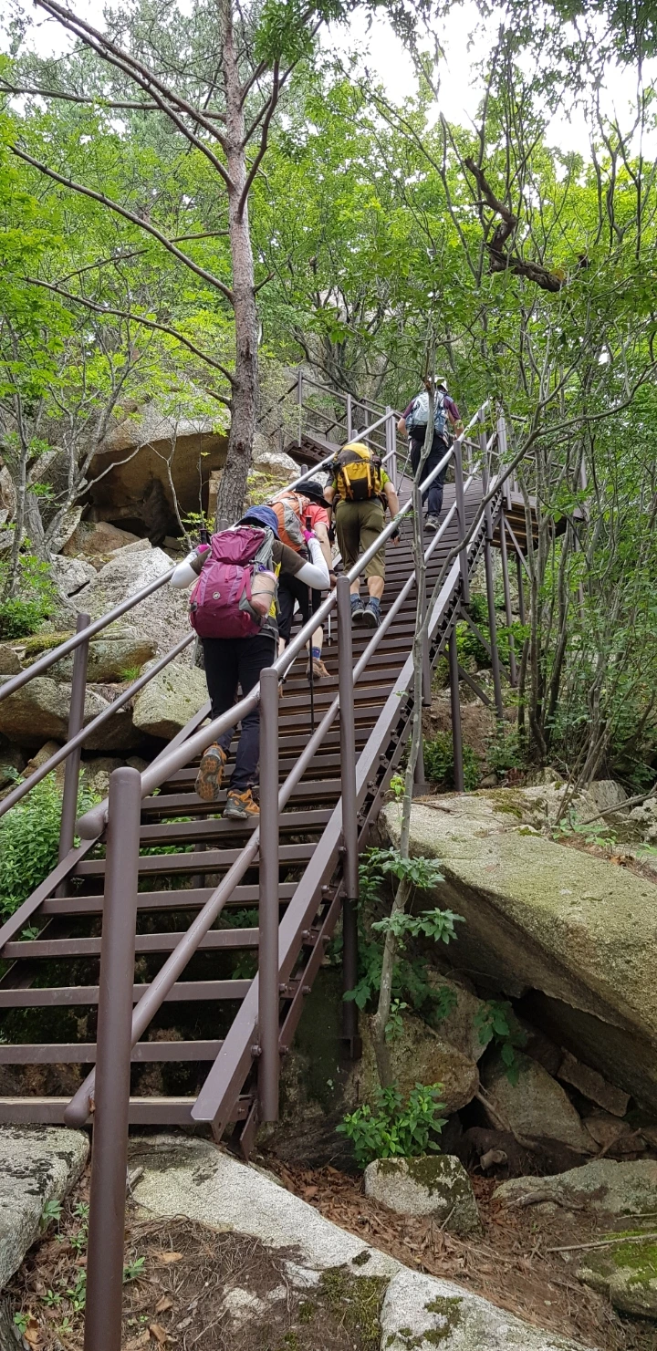 앞서 갔던 산객이 지갑과 휴대폰이 든 작은 가방을 초입 계단 난간에 두고 왔다며 되돌아 내려오고 있다. 조금 올라가려니 그분 모자도 땅에 떨어뜨려 놓았다. 산에서 버려야 할 것은 땀과 상념뿐일 터인데, 그 산객은 선경에 마음을 빼앗겼던 것일까, 아니면 더위에 정신이 일시 혼미해졌던 걸까?