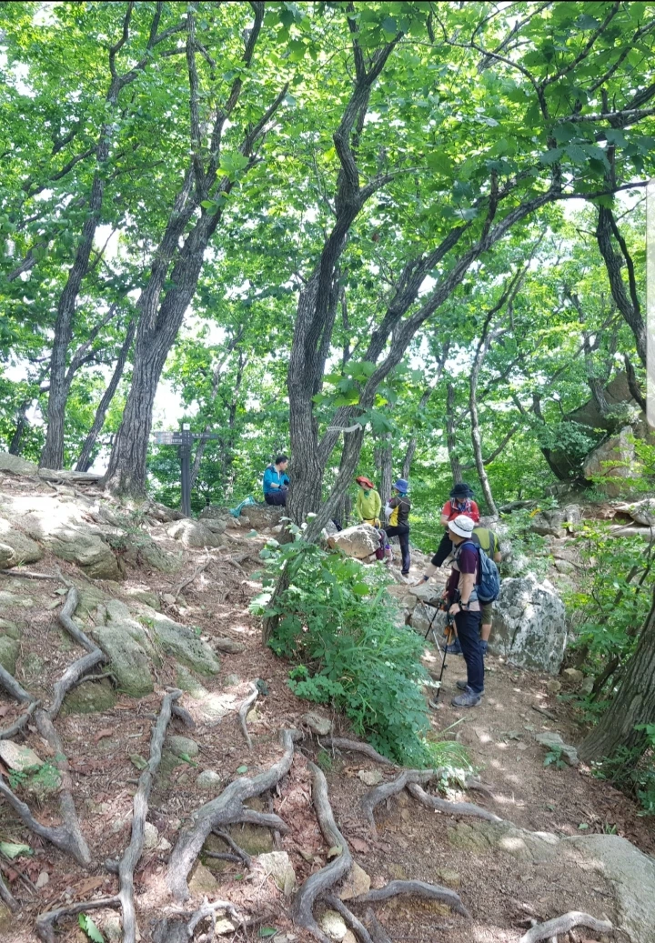 어느 산이든 산객들이 넘쳐나는 요즘은 산짐승도 배려해야 하니, 정상까지 거리를 가늠할 수 있던 정상에서의 '야호' 함성도 기대할 수 없다. 정상으로 난 마지막 능선은 레드카펫을 대신해서 솔이 울창한 평평한 흙길이 힘겨운 산행의 노고를 치하하듯 맞아준다. 키 큰 나무들에 둘러싸여 조망이 없는 해발 964미터 정상에는 표지석과 벤치가 자리하고 있다.