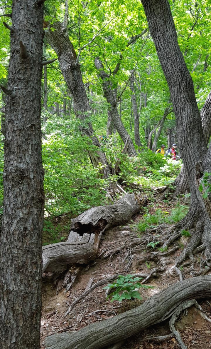 비로봉까지 고목 숲으로 덮인 1.5km 능선길은 바람이 좋다. 에어컨 바람과는 견줄 수 없는 상쾌함이 마음까지 스며든다. 정상 아래 막바지 태양의 열기로 나무계단 위 폐타이어 깔판에서 피어오르는 고무냄새가 코끝을 찌른다.