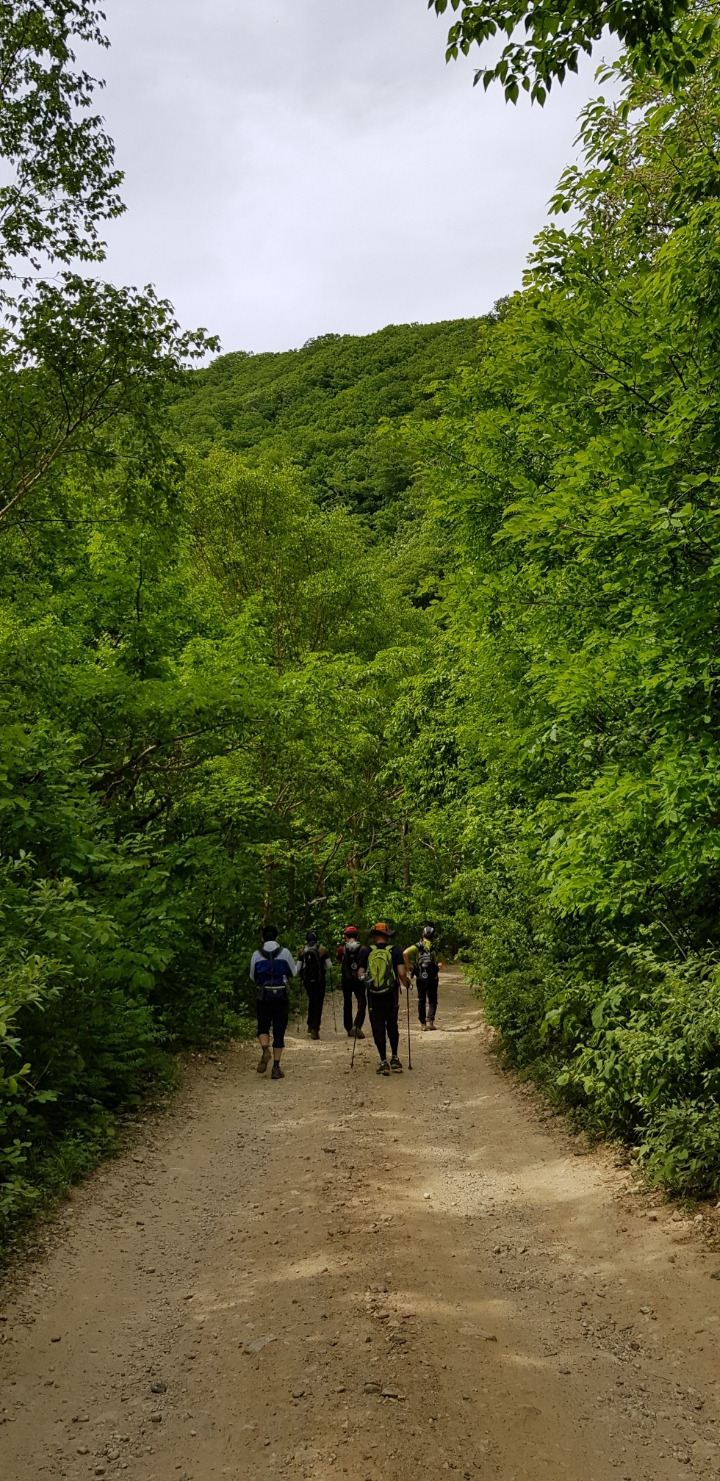 고사한 주목과 키가 작지만 둘레가 굵은 당당한 주목이 옆에 서있는 공터에서 허기를 채웠다. 상왕봉과 두리봉 사이 길림길에서 임도로 내려섰다. 녹음이 짙은 가파른 능선을 끼고 내려가는 임도에도 시원한 바람이 그치지 않고 불어온다. 굽이굽이 휘돌며 비로봉 아래 쪽로 깊숙히 파고들고 나는 임도 위로 지나온 능선이 거대한 담장처럼 막아섰다 비켜섰다 한다.