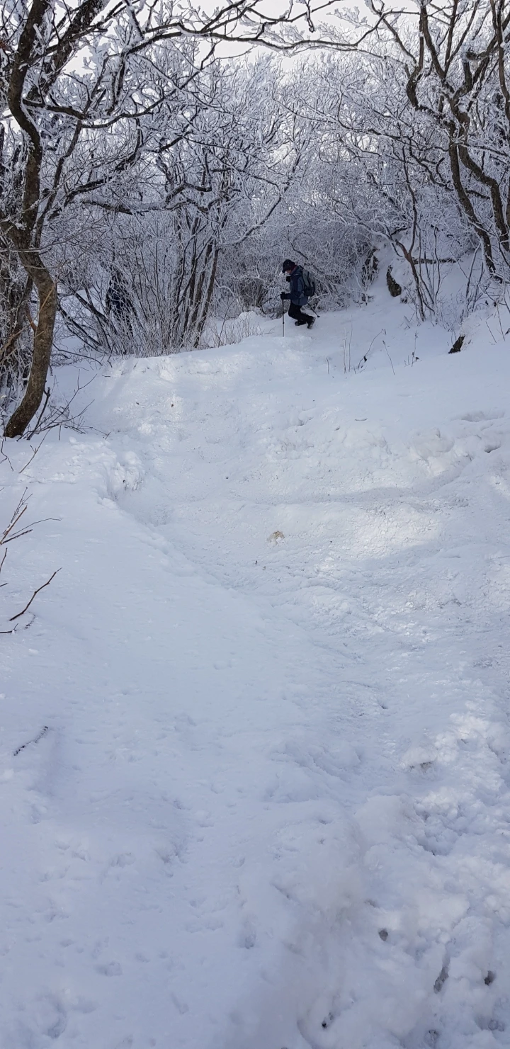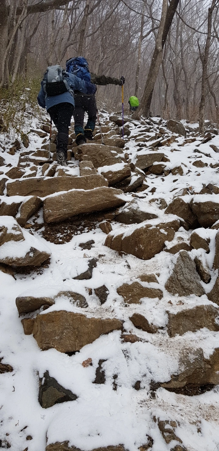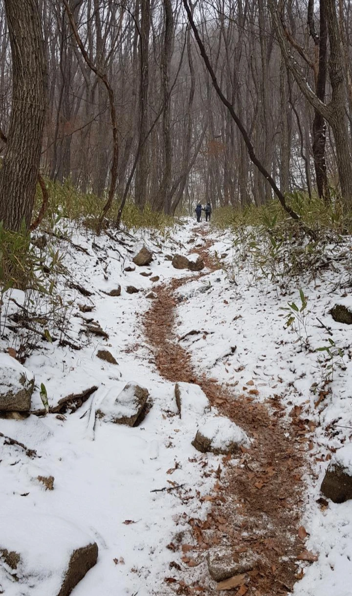 해발 1,000미터쯤에서 다시 산죽 군락이 나타나고 눈은 오가는 산객들 발길에 녹아 한결 걷기가 편하다. 해발 900 지점 계곡에 놓인 다리를 지나면 쭉쭉 뻗은 낙엽송이 보기에 좋은 평탄한 숲길이다. 낙엽송 줄기 사이로 내리비치는 따사로운 햇살이 반갑다.