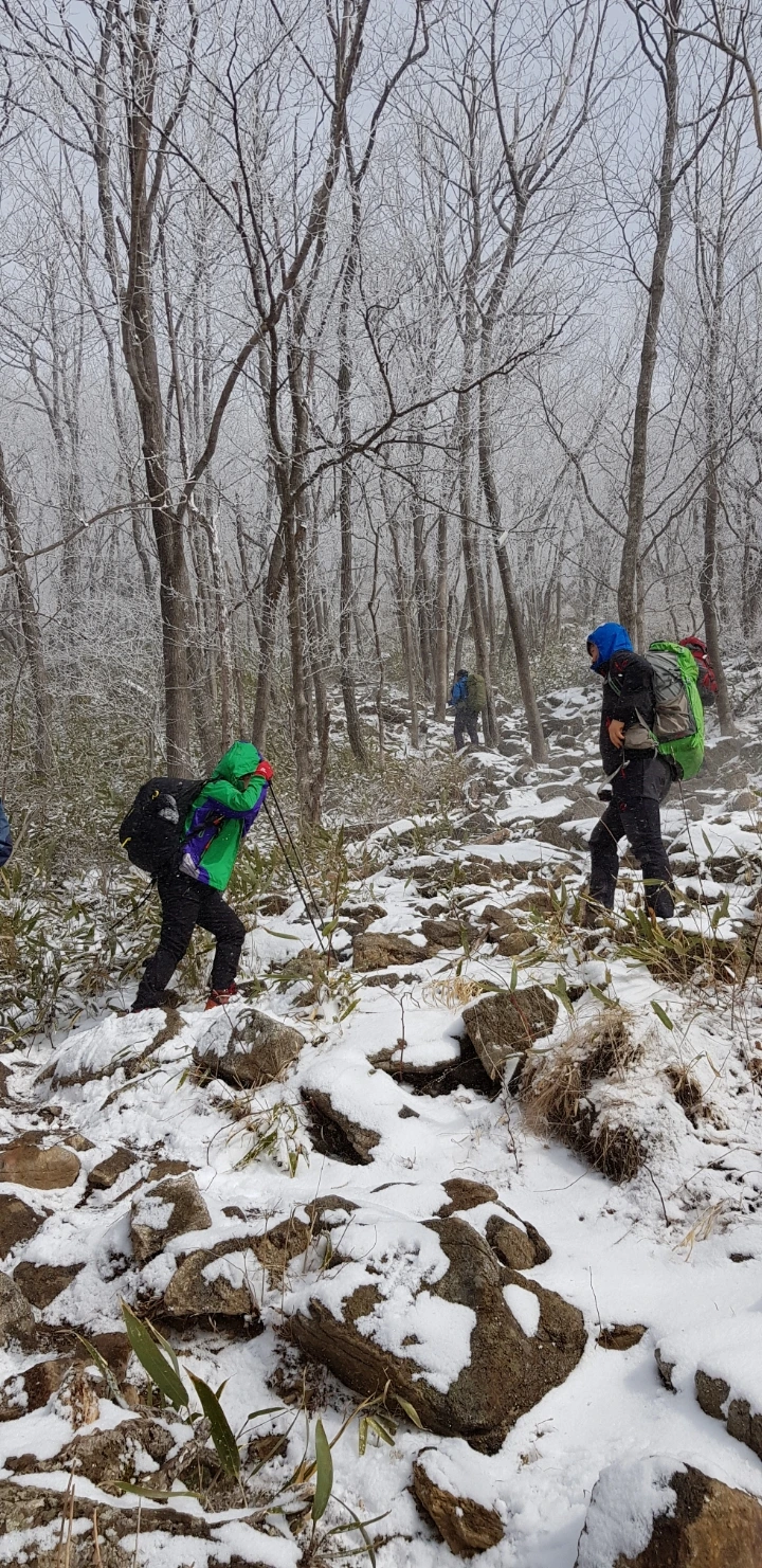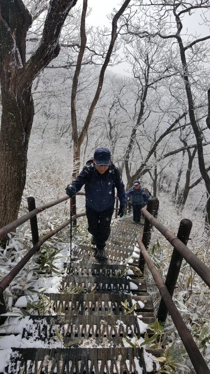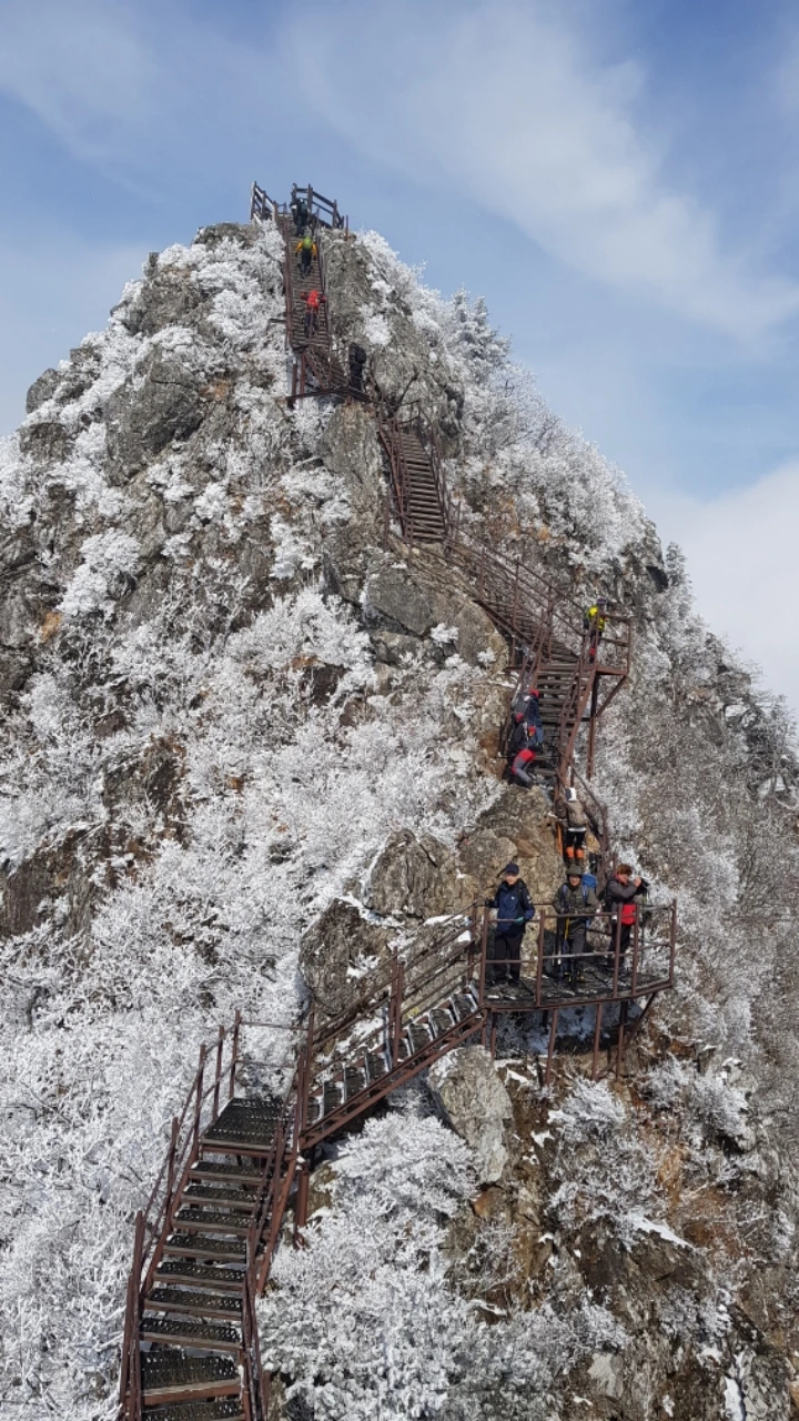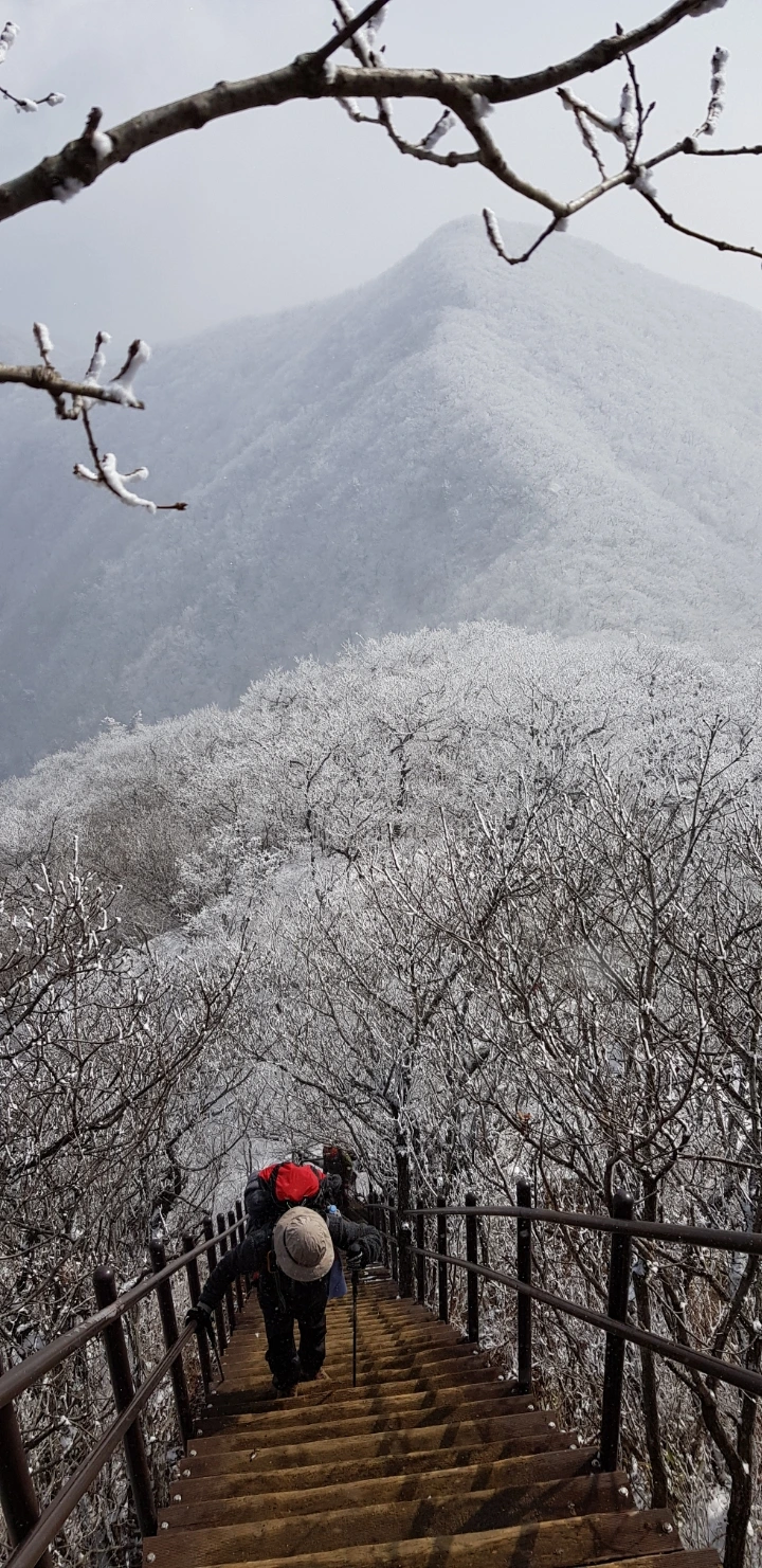 긴 계단길 해발 1,200미터 지점에서 바람은 거세지고 숲을 이룬 나무들은 가지마다 온통 상고대로 덮여 장관을 연출한다. 남덕유산 주봉 동쪽의 동봉으로 이어진 능선 마루에 올라섰다. 배꼽시계에 굴복한 산객들이 삼삼오오 자리를 잡고 허기를 달래고 있다.
