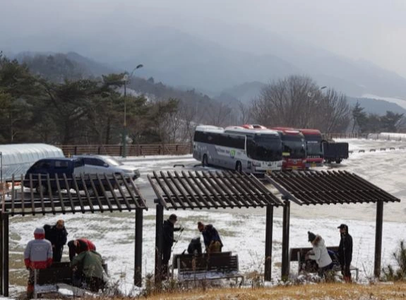 7시경 산행 버스가 남덕유산 남동쪽 함양의 영각사를 향해 출발했다. 경부고속도로로 들어서자 거짓말처럼 눈이 내리기 시작하더니 죽암휴게소를 지날 무렵 멈추었다. 앞 좌석에 나란히 앉은 년배의 산행 팀이 나누는 산행코스 얘기에서 들뜬 마음이 전해온다. 마음에 이는 설렘은 나이와는 무관한가 보다.