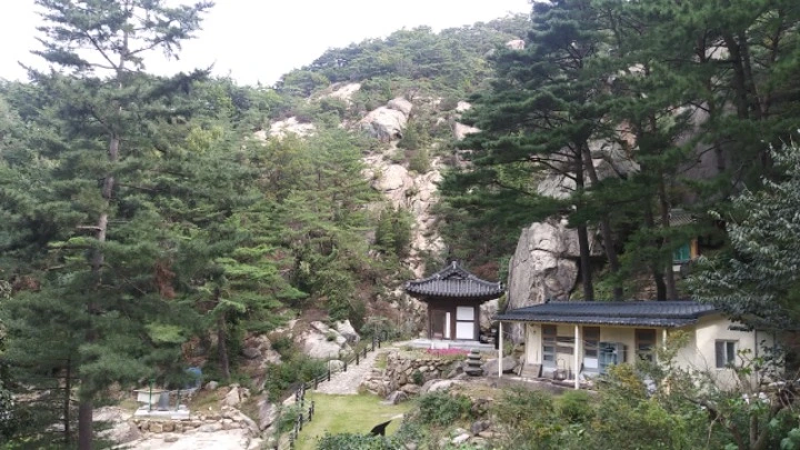연초록 이끼를 머금은 자갈이 드러난 비탈진 시멘트 길을 오르면 열반곡 제3 사지의 금방이라도 자빠질 듯 기울어진 채 앞을 막아선 '큰 곰바위' 앞에 관음사가 자리한다. 사랑채 마냥 작은 대웅전 문고리를 당기니 한 척 크기 하얀 돌부처가 지키고 계시다. 그 오른쪽 비탈의 산신각도 잠겨있고 인기척이 없어 버려진 절처럼 보인다.