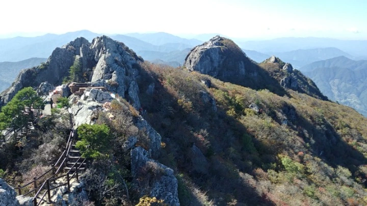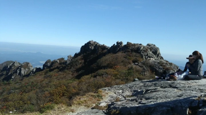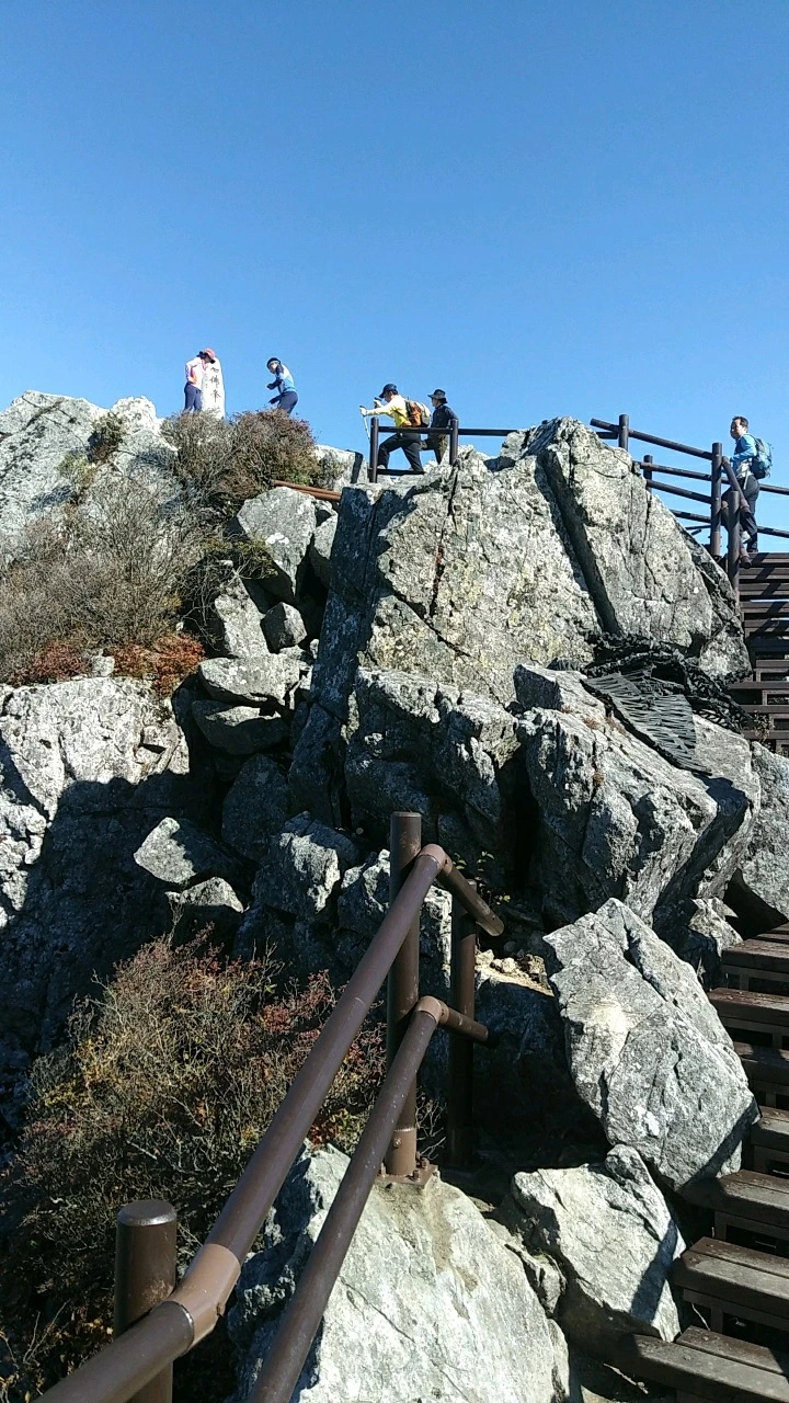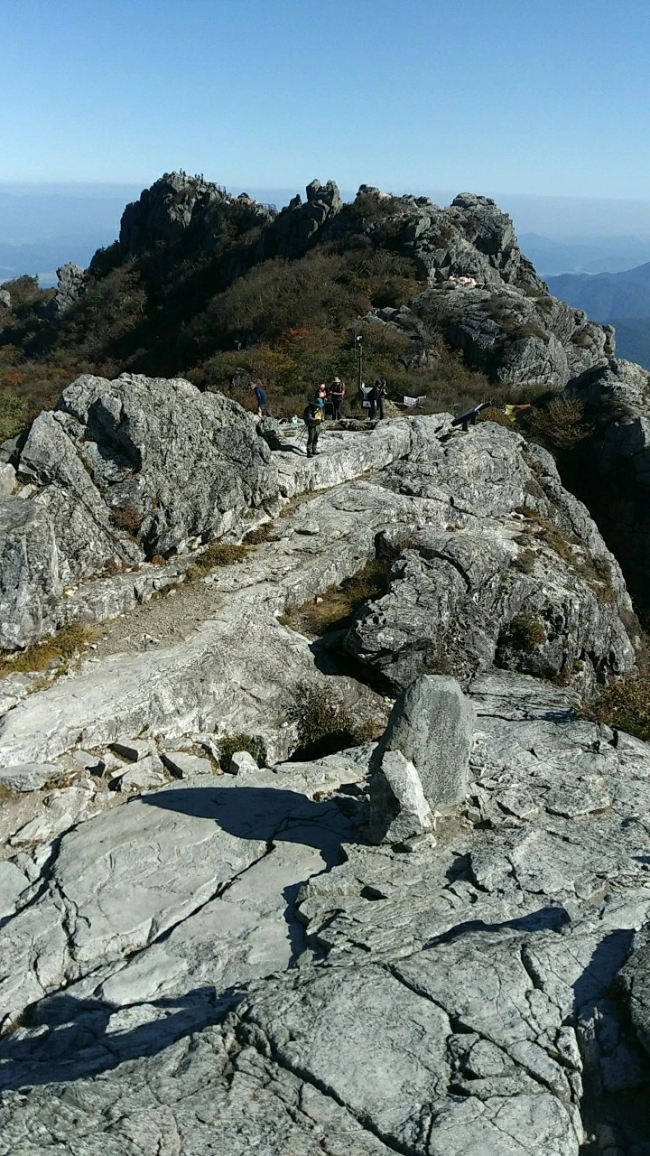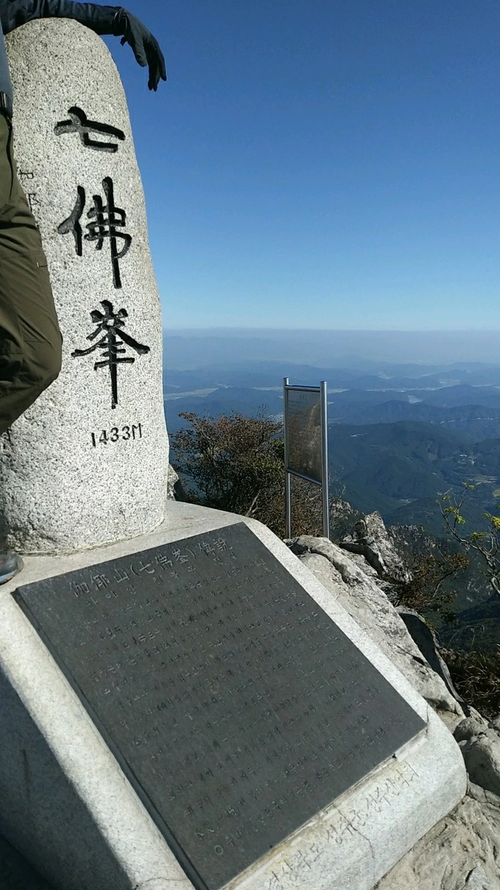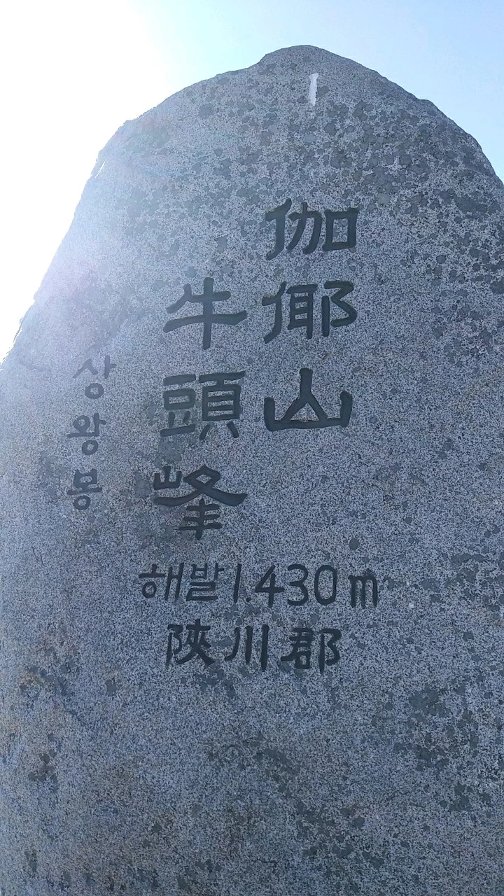 우두봉으로도 불리는 해발 1430미터 상왕봉은 칠불봉과 원래 하나였다가 갈라져 뚝 떨어져 나앉은 듯 지척에 솟아있다. 정상부에 거대한 암반이 불쑥 솟구쳐 있는 모습이나 바위 비탈에 서있는 정상석이 관악산 연주봉과 흡사해 보인다. 택리지에서 가야산 기암괴봉이 불꽃을 닮았다 하여 '석화성(石火星)'이라 부르기도 했다니 얼핏 '남녘의 관악산이랄까'라는 생각이 들었다.