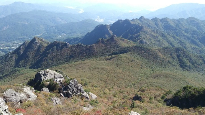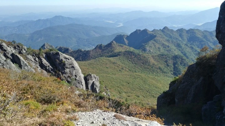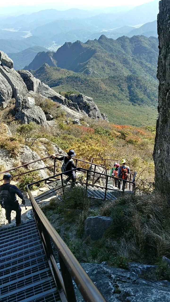 만물상 탐방로 입구를 들어서면서부터 가파른 경사가 시작된다. 초입부터 몸에서 땀이 배어 나오고 얼굴엔 땀방울이 맺힌다. 바위길 계단길 벼랑 데크길 등을 지나며 앞에 솟아 있는 기묘한 생김의 바위산을 올려다보며 감탄사를 토해냈다. 능선 마루 바위나 계단길에 멈추어 서면 장쾌하게 뻗어 내린 산맥들은 생동감 있고 그 사이로 펼쳐진 성주의 들판이 멀리 아득하다.