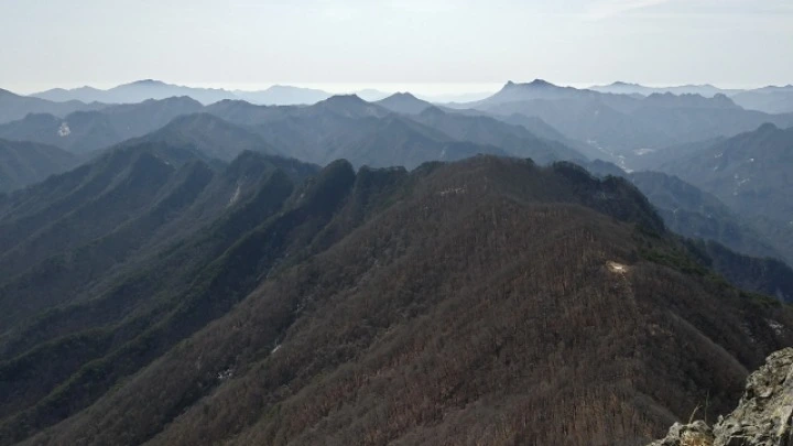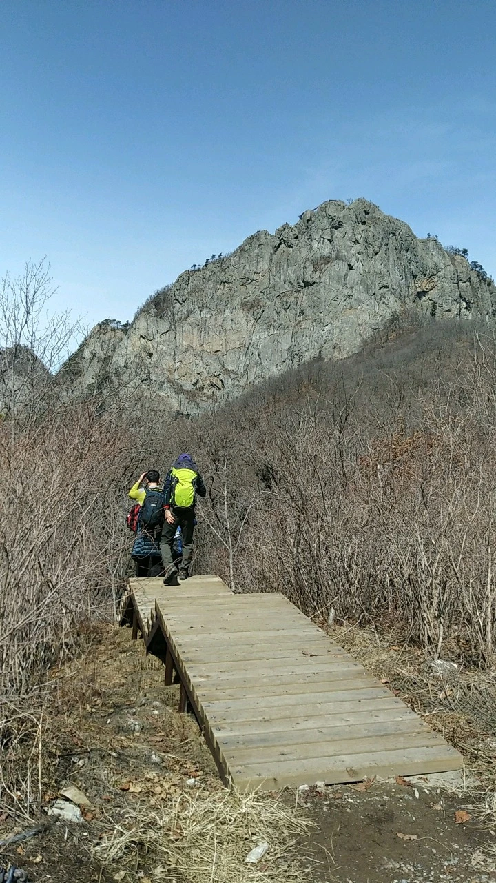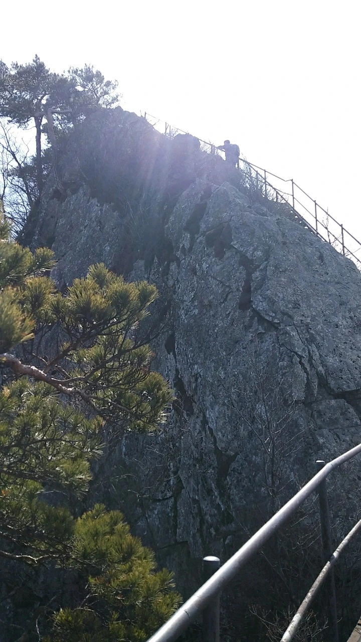 한참 만에 계단 길을 벗어나 영봉 바위 절벽 아래를 우측으로 휘돌아 절벽 멀찍이 능선에 서면 150여 미터 거대한 암벽이 한눈에 들어온다. 하산길 복슬강아지 꼬리처럼 얼굴에 살랑대며 와 닿는 미풍이 좋다.