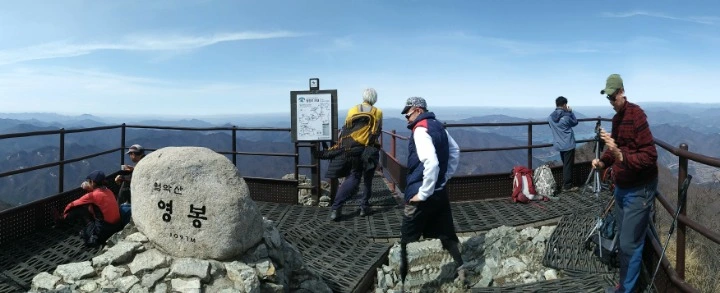 둥근달처럼 동그란 구형 바위 돌에 새겨진 '영봉' 글자가 보름달처럼 옹골차다. 그 표지석과 함께 사진을 남기려고 여러 산객들이 주변에서 기다리고 있다. 기다리는 산객들은 아랑곳 않고 표지석 좌우로 오가며 온갖 포즈를 취하며 셔트를 눌러대는 중년 부부 한 쌍은 끌끌 혀를 차게 만든다.