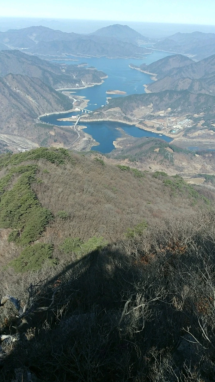 해발 1097미터 월악의 맏형 영봉은 호락호락하지 않고 힘겹다. 눈을 질끈 감고 사다리처럼 암벽 위로 놓인 철 계단을 올랐다. 숨이 턱밑까지 차오를 무렵 먼저 오른 산객들의 모습이 하나 둘 보이고 정상이 너른 데크를 허락했다. 영봉 사방으로 펼쳐진 모습은 말 그대로 일망무애, 걸리적거리는 것 하나 없이 남쪽으로 멀리 북바위산 박쥐봉 주흘산 등이 하늘과 맞닿아 있고 북쪽으로 지나온 중봉 하봉 너머로 충주호가 그림처럼 누워있다.