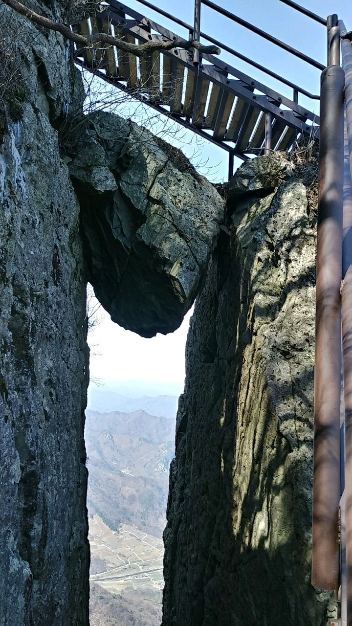 하봉에서 중봉까지는 지척이지만 오금이 저리도록 아찔한 구름다리와 철 계단을 지나야 만 한다. 중봉 아래 두 개의 절벽 틈새 위에 거대한 바위가 걸린 돌문이 절경이다. 그 위로 계단길이 놓여 지나기는 한결 수월한데 절묘한 모양새는 계단에 가려 퇴색되었다.