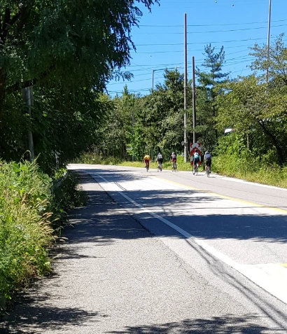 반대편에서 한 무리의 라이더들이 막 여우고개 위로 올라서고 있다. 먼저 고갯마루에 올라선 선두가 뒤이어 오르는 동료들을 스마트 폰에 담는다. 뛰거나 라이딩을 하면서 중간중간 떠오르는 생각의 단편들을 잡아두기는 어렵지 싶다.