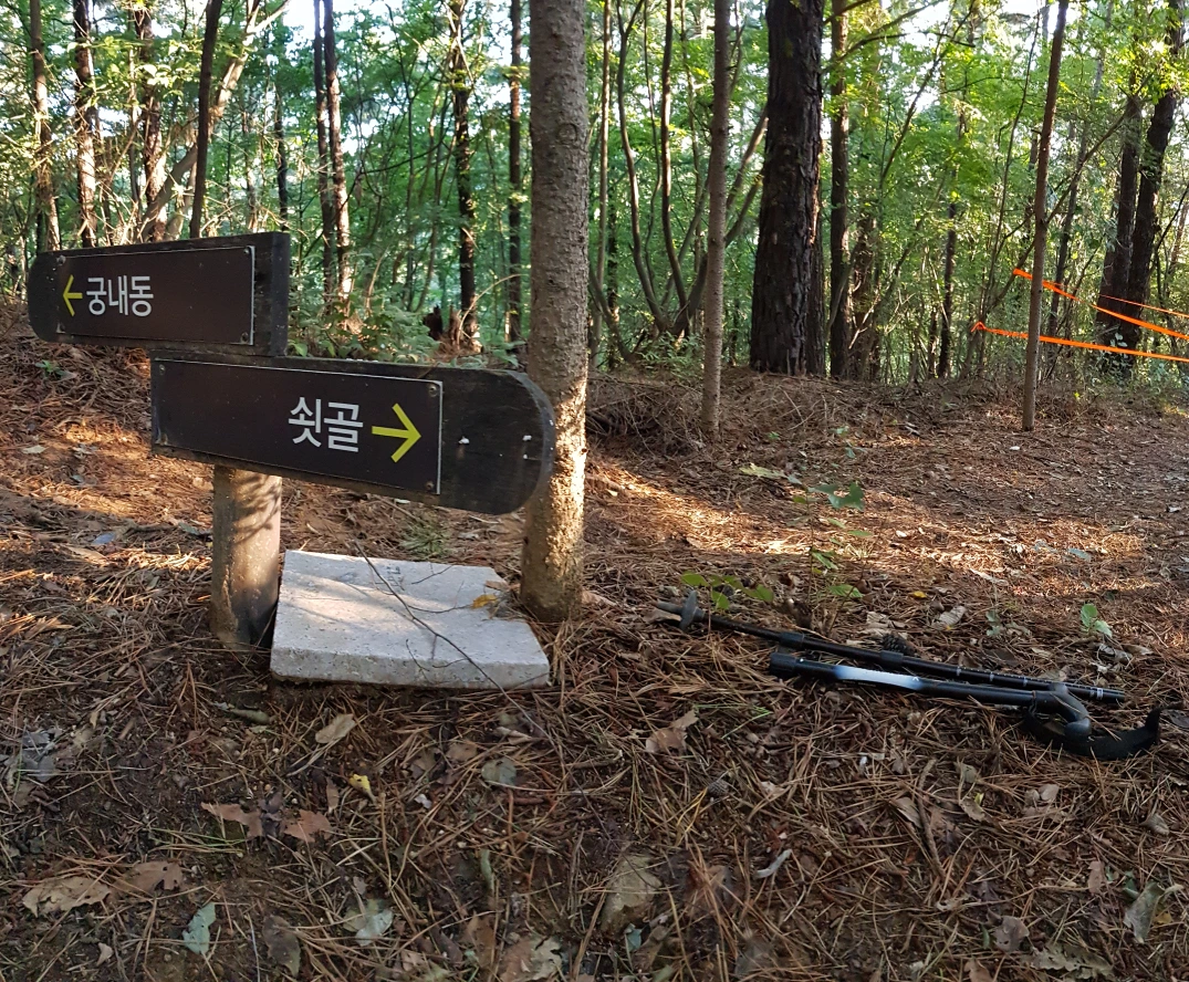 궁내동과 쇳골 방향을 알리는 이정표가 나왔다. 그 옆에 놓인 스틱 하나가 자신을 두고 간 주인을 기다리고 있다. 모기에 물린 손등이 따끔거리고 가렵다. 귀를 시원하게 해 주거나 계절을 알려주는 귀뚜라미가 산객에게 위안을 주는 친구인 반면 모기는 성가신 존재다.