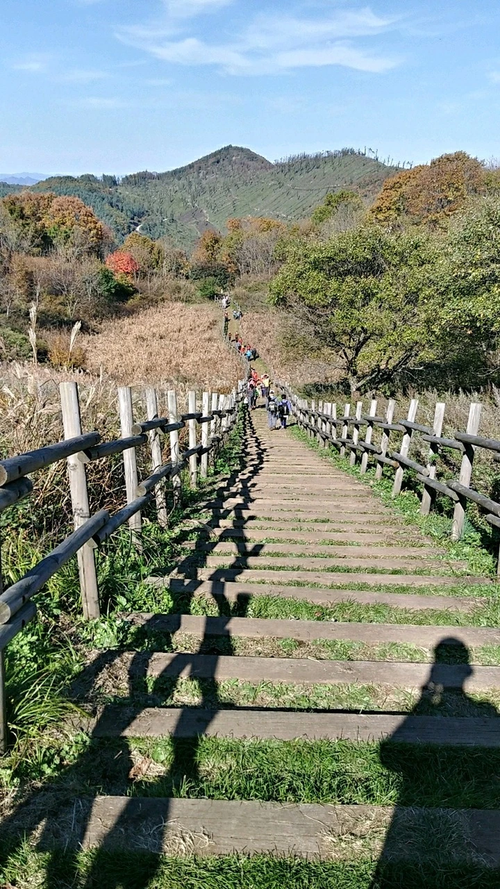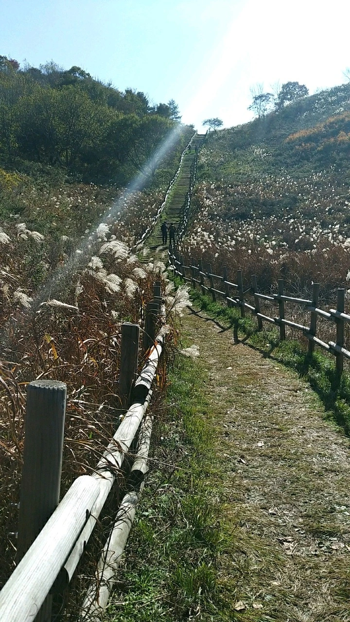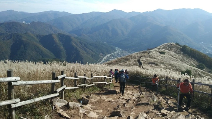 햇빛이 쏟아져 넘어오는 계단을 올라 능선 위로 올라서면 정상까지 이어진 너른 능선을 따라 참억새밭의 장관이 펼쳐져 있다. 능선마다 등산로를 따라 사람들이 억새밭과 어우러져 추억을 담기에 여념이 없다.