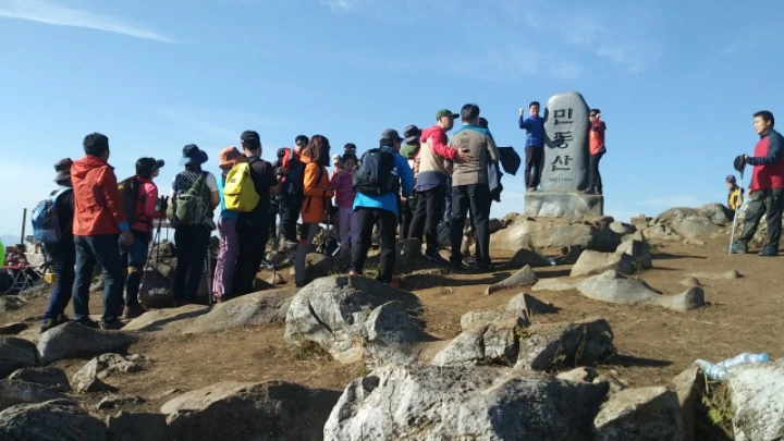 해발 1,119미터 민둥산. 나무가 없는 벌거숭이 산을 부르는 일반명사인 민둥산이 이곳 정선에서 고유명사가 되었다. 산정에서는 사방이 장쾌하게 조망되고 그 정상 표지석 부근에는 기념사진을 남기려는 사람들로 줄이 길다.