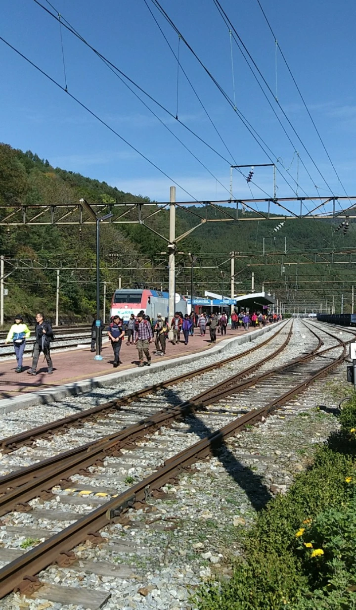 사북과 석항을 연결하는 38번 국도가 민둥산로와 교차하는 지점의 날머리로 내려서서 도로를 따라 20여 분 만에 민둥산역에 도착했다. 역사 안팎에는 산행이나 억새꽃 구경을 마치고 기차를 기다리는 사람들이 삼삼오오 모여있다.