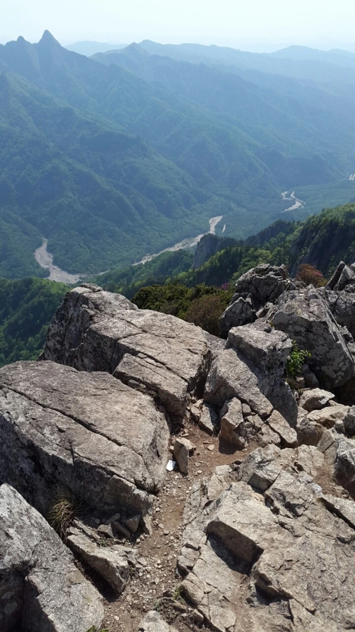 이 코스를 따라가며 오른쪽으로 눈을 돌리면 멀리 소청에서 백담사 쪽으로 길게 뻗어 내린 용아장성, 이름처럼 용의 어금니가 능선에 드문드문 박힌듯한 모습의 웅장한 능선을 온전히 조망할 수 있다. 서북능선은 자신의 세계에 매몰되지 않고 상대를 돋보이게 해주는 배려심 깊은 존재다. M이 스틱을 들어 '봉정암'이라며 가리키는 쪽을 보니 소청 바로 아래 능선에 안긴 그 모습은 멀고도 희미하다.