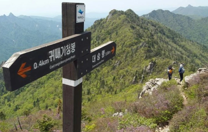 한계령 고개에서 이곳까지 2.3km는 급경사 오르막 길이었고, 여기서 오른쪽 대청봉까지 6km 좌로 귀때기청봉까지 1.6km 대승령까지 7.7km는 오르내리는 능선 길이다. 대부분의 산객들이 향하는 대청 쪽 반대인 대승령 쪽으로 방향을 잡고 귀때기청을 향해 발길을 옮긴다.