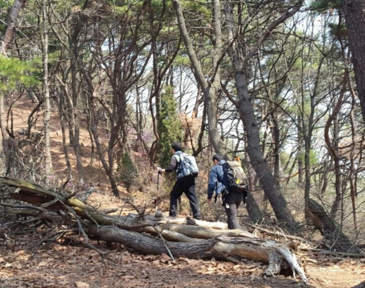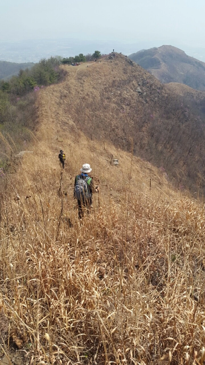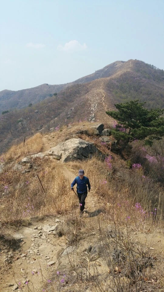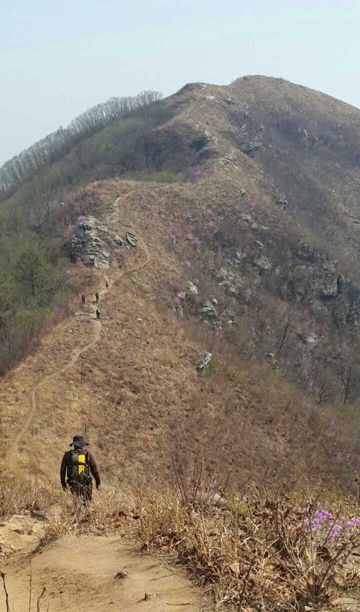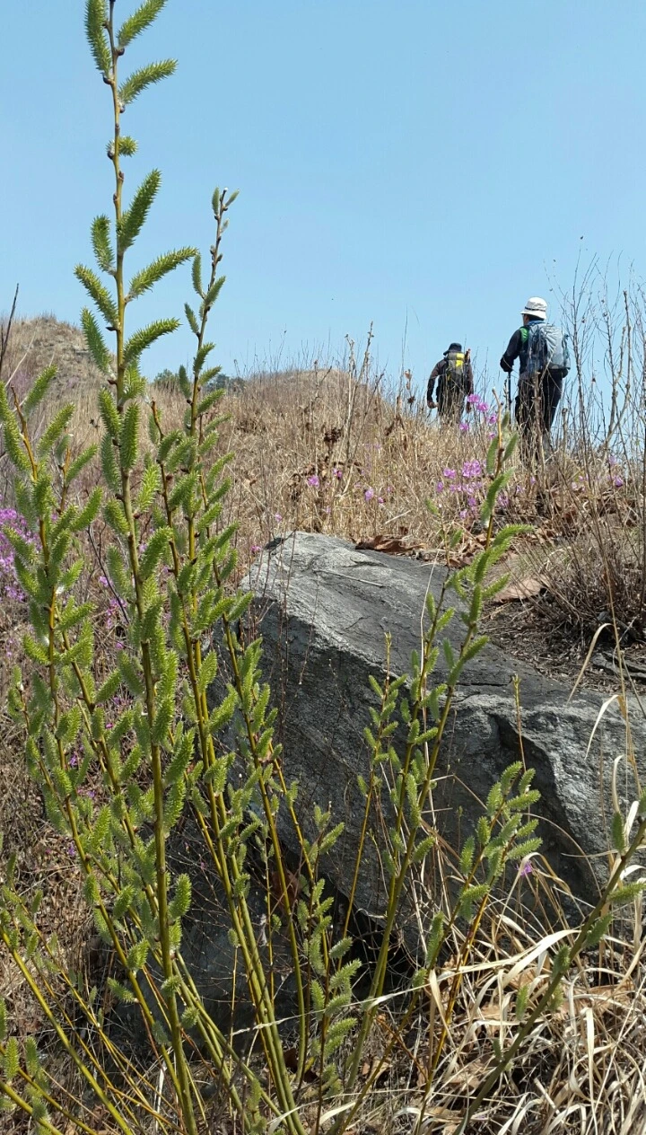 천덕봉으로 오르는 긴 능선엔 나무가 없고 좌우가 탁 트여서 조망이 시원하다. 불어오는 상쾌한 바람은 윈드재킷 속 셔츠를 흥건히 적셨던 땀을 말끔히 씻어 주었다. 진달래는 여기저기 군락을 이루며 폈고 이름 모를 꽃들은 그 길 곳곳에서 빼꼼히 얼굴을 내밀고 인사한다. 물 가에서 자랄법한 버들강아지 모양의 나무도 바위에 기대어 봉오리를 틔웠다.