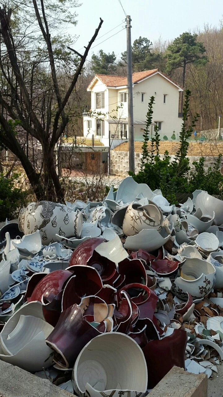 시골마을 동구 밖 국도변 전철역에서 남정리 마을로 들어서서 정개산 오르는 초입을 더듬었다. 전원주택들이 산뜻하게 들어선 산자락 밑 논밭 사잇길 끝에 도요 작업장이 나왔다. 마당 가장자리에는 깨지고 일그러진 도자기 파편이 수북하게 쌓였고 인부들은 낡은 가마 옆에 새 가마 하나를 더 만드는 작업에 여념이 없다.