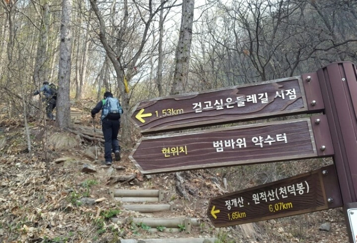 속살을 드러낸 민머리 천덕봉과 원적산 그리고 두 봉우리를 잇는 긴 능선 길은 아마추어 사진작가들의 야외 세트장이다. 카메라를 들고 장쾌한 산세와 그에 어우러진 산객들의 모습을 담기에 바쁘다. 산행 방향이 서로 다른 산객들은 서로 스쳐 지나며 인사말을 건네고 서로 사진을 담아주기도 한다.