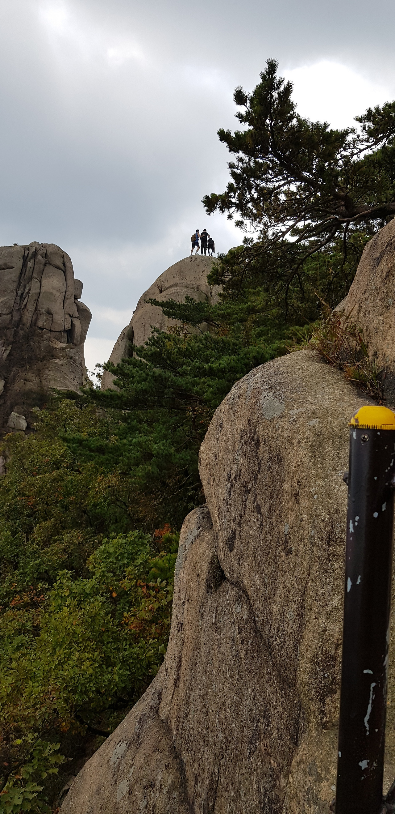 출입이 금지된 자운봉 옆 가파른 신선대 정상으로 길게 늘어선 산객들 줄이 줄어들 기미가 없다. '신선대 정상 726m'라 적힌 푯말을 점령한 듯 젊은 남녀 산객들이 줄지어 기다리는 뒷사람은 아랑곳 않고 온갖 포즈를 취하며 사진 찍기에 여념이 없기 때문이다. 지척의 범상치 않은 모습의 해발 740m 자운대를 조망하는 것에 만족하며 오봉 쪽을 향해 발을 옮긴다.